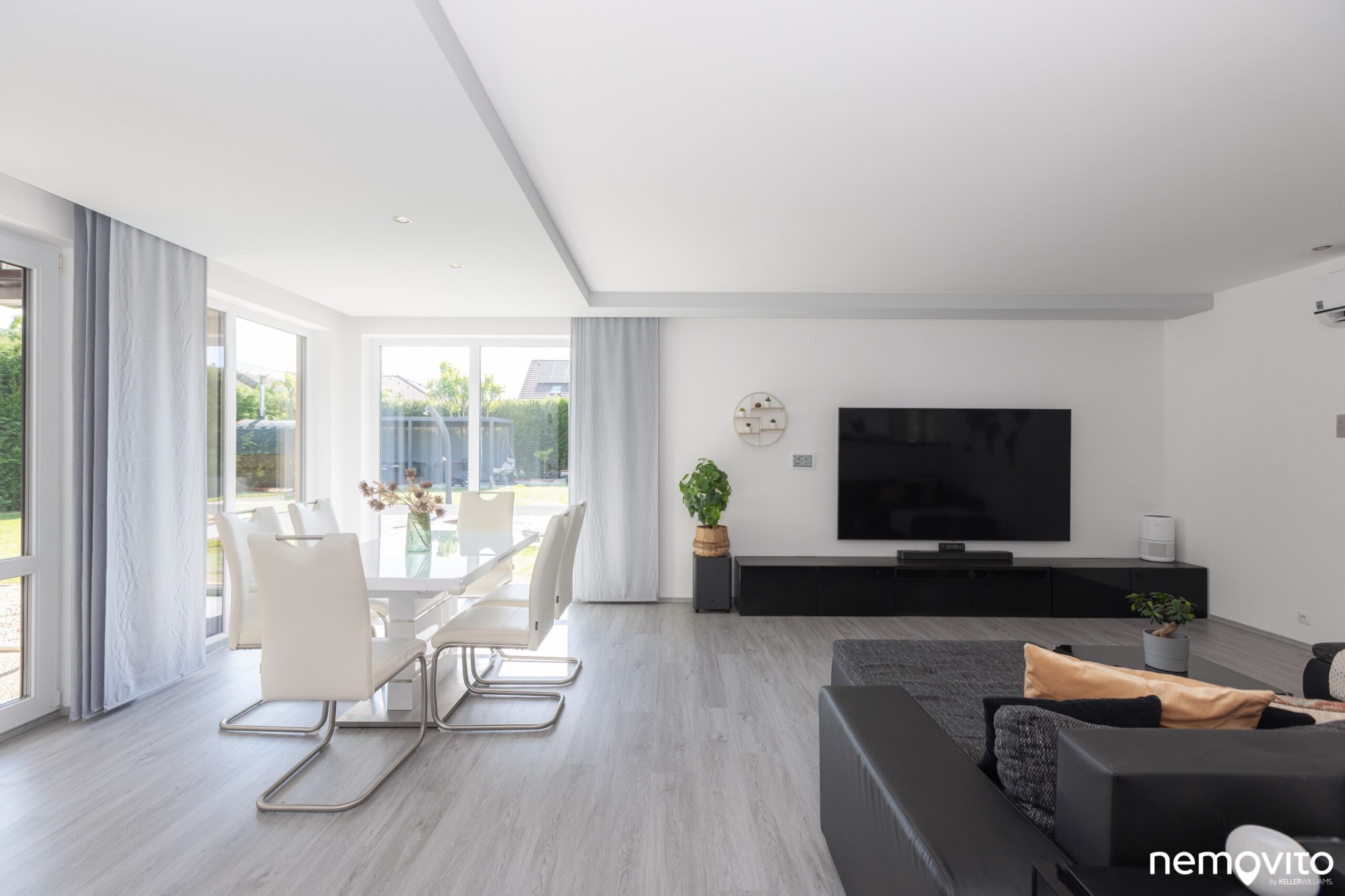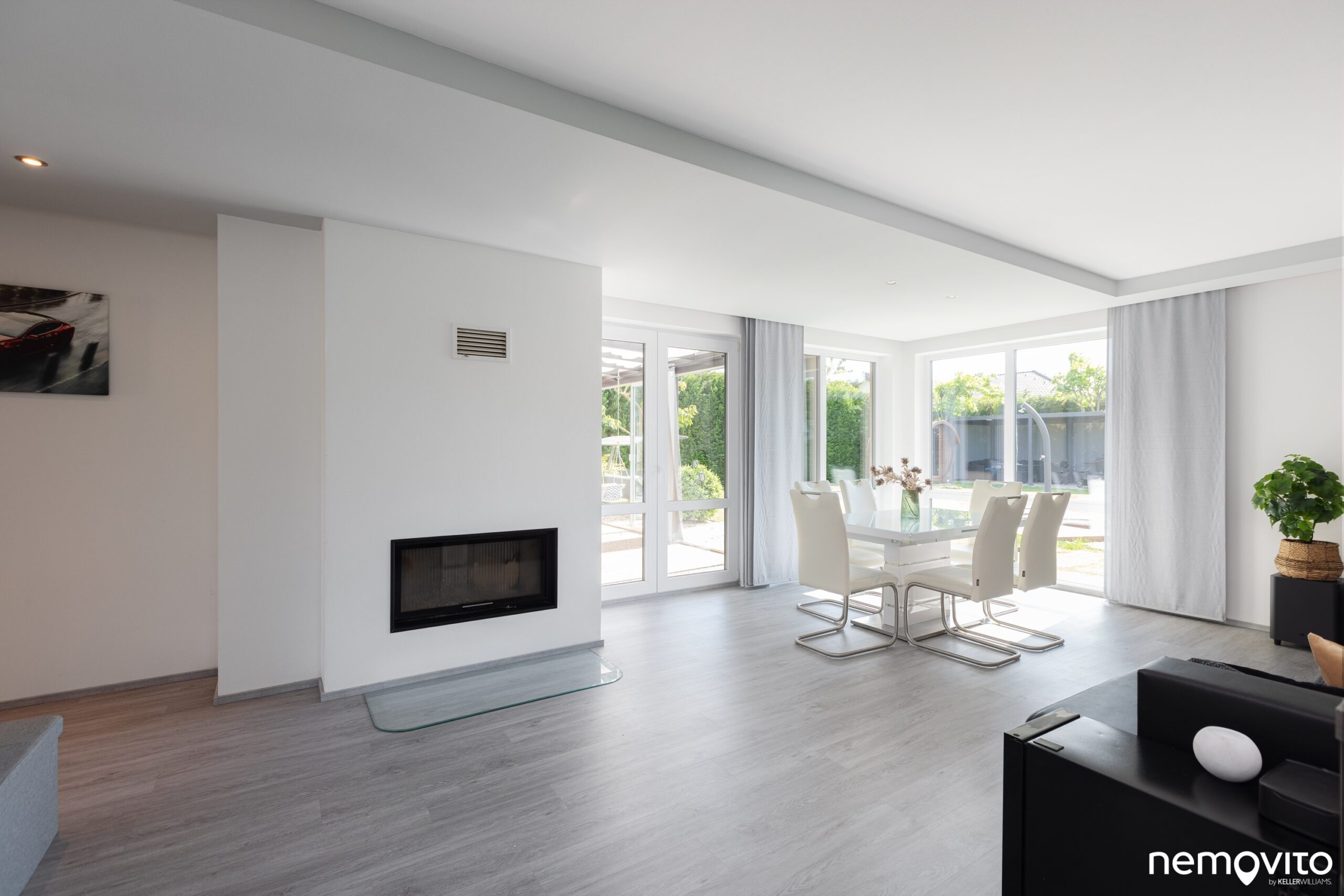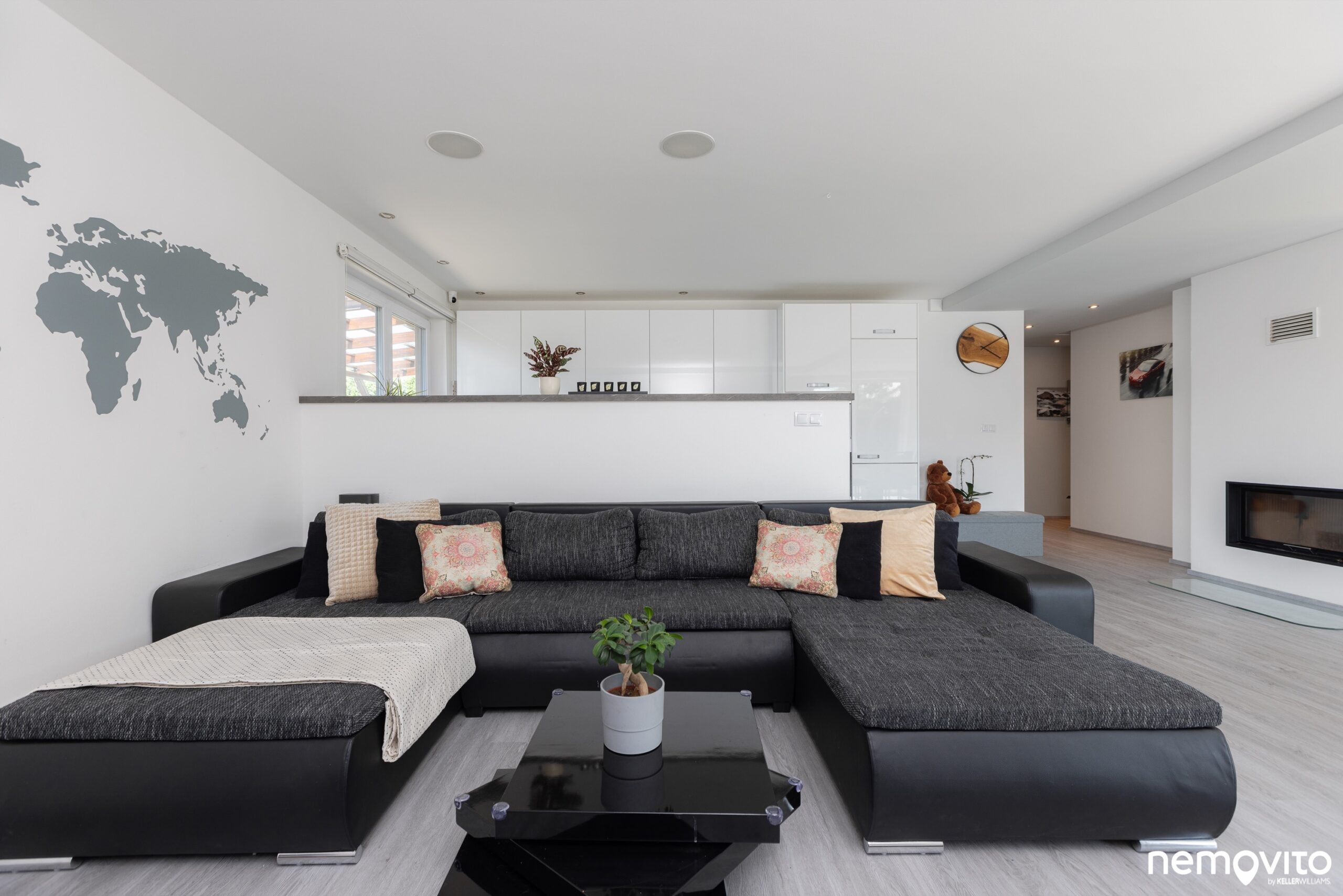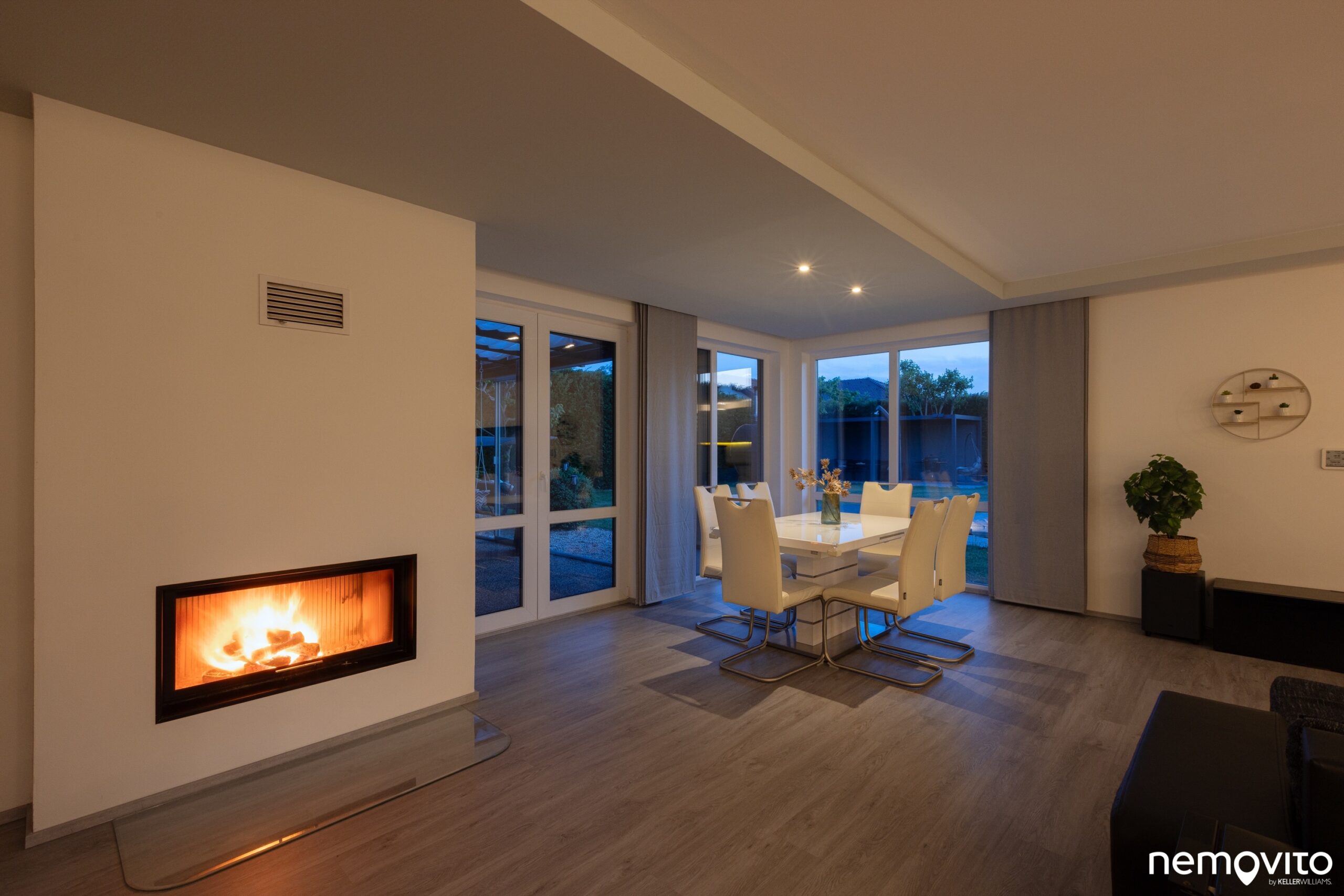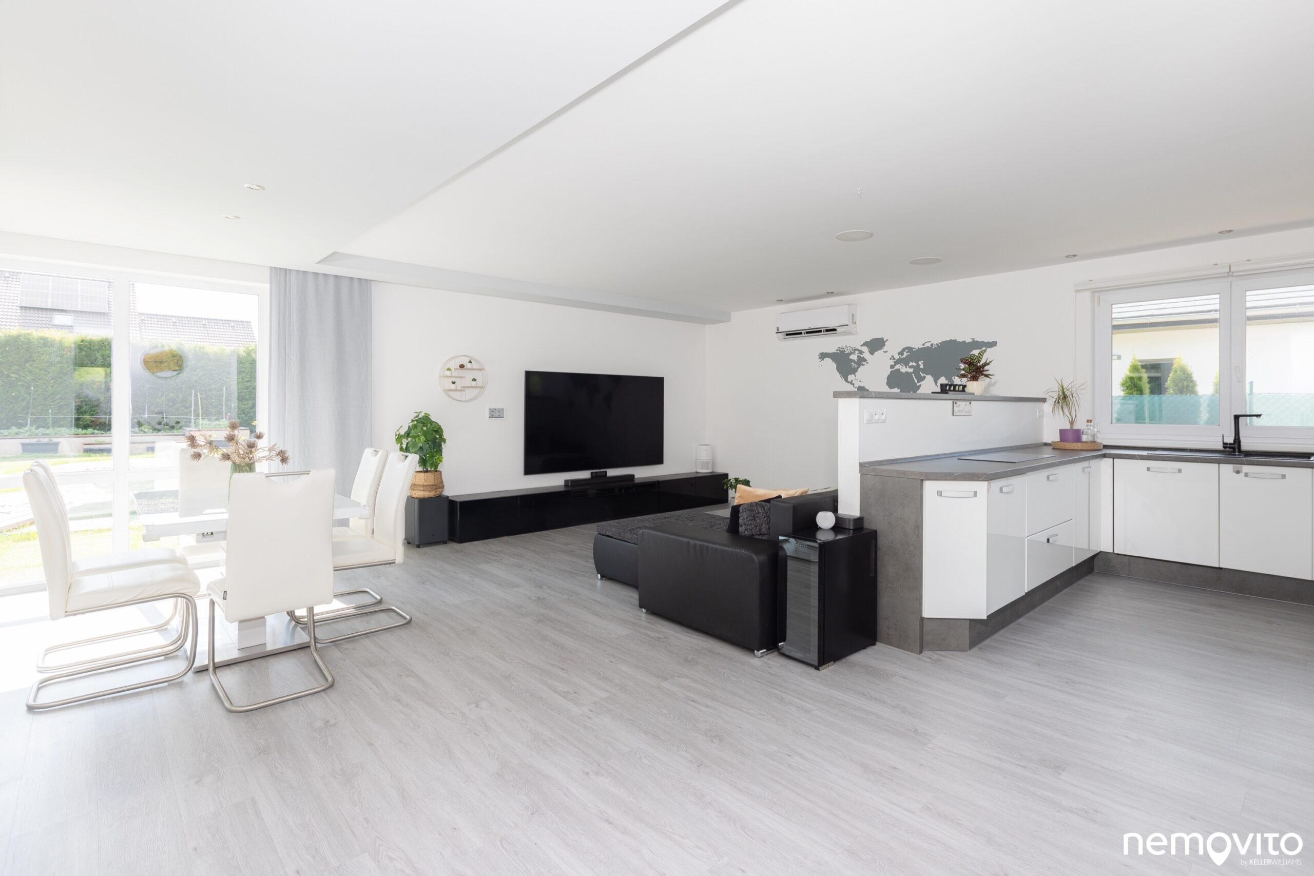 Dostatek místa na 3 prostorné zóny. Jídelna, obývák i prostor kuchyně. Ten je od obýváku oddělen polo příčkou. Radiátory nehledejte, v domě je podlahové topení.