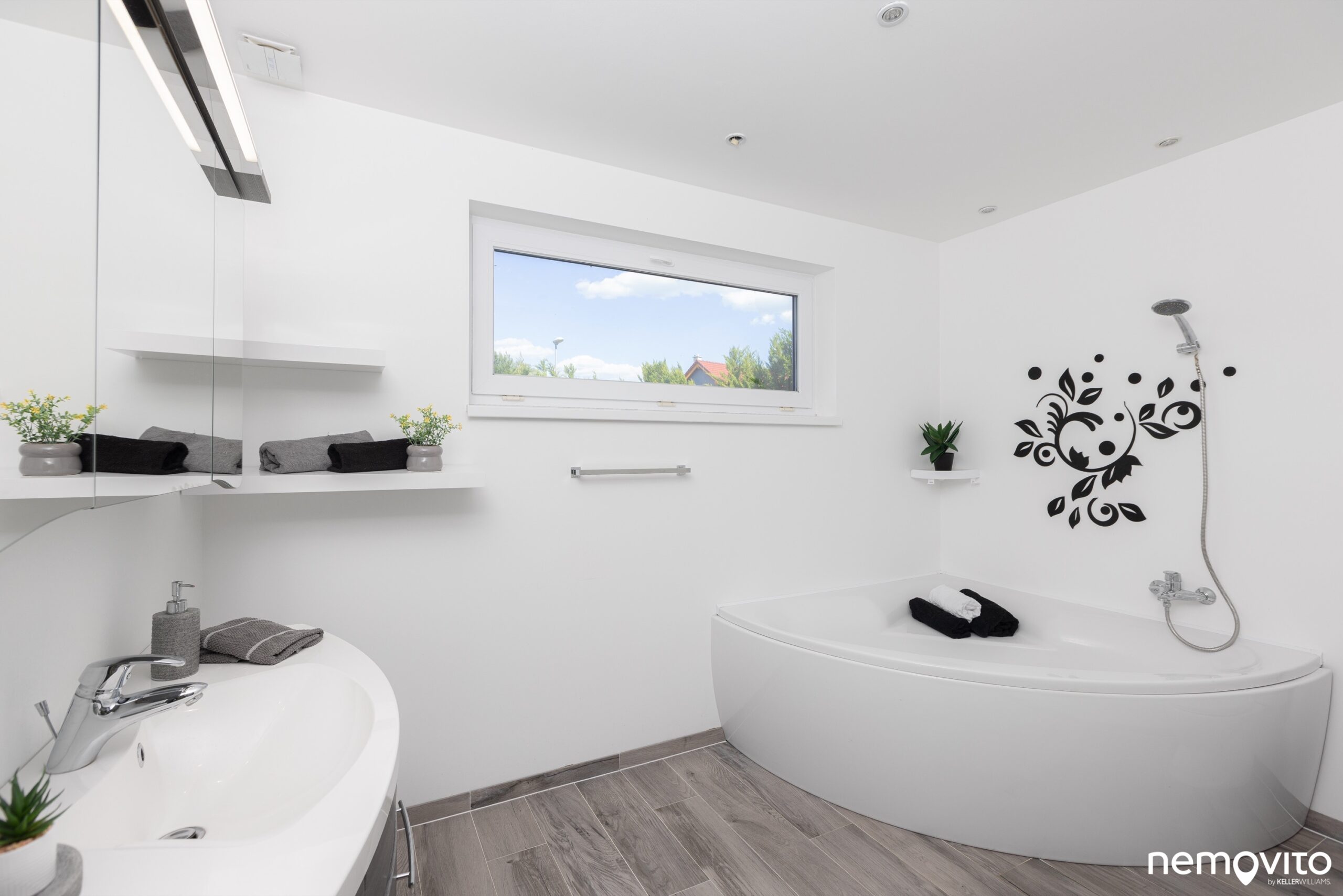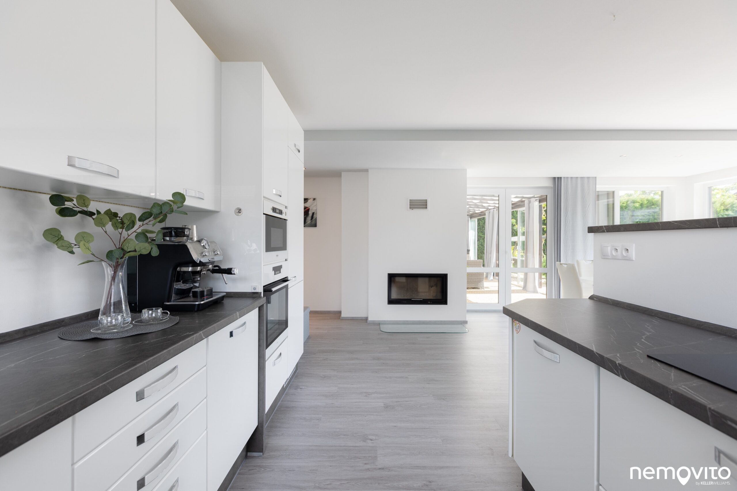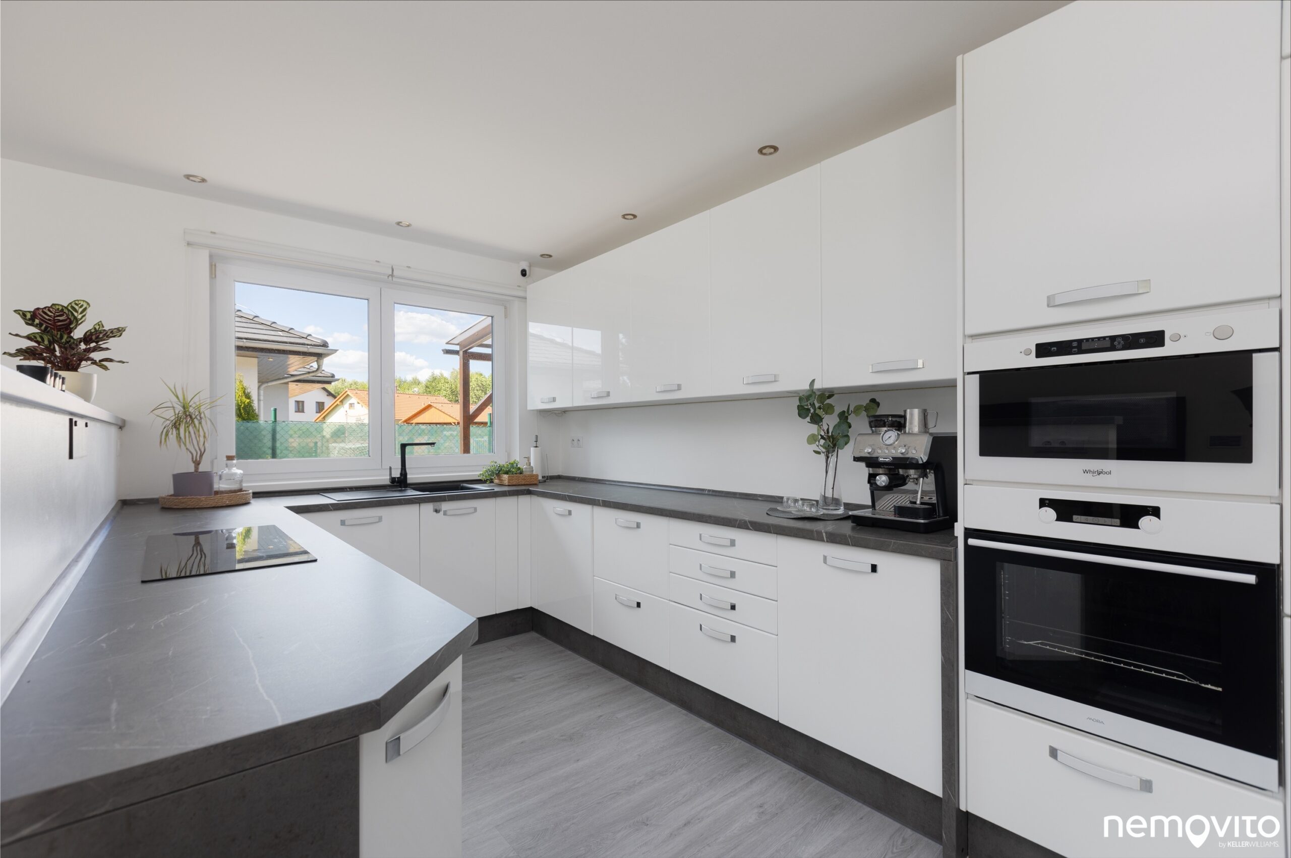 Kuchyňská linka ve tvaru písmene U znamená velký pracovní prostor, který navíc prosvětluje velké okno. Z důvodu zachování soukromí je tímto směrem jediné (na sever, k sousedovi).