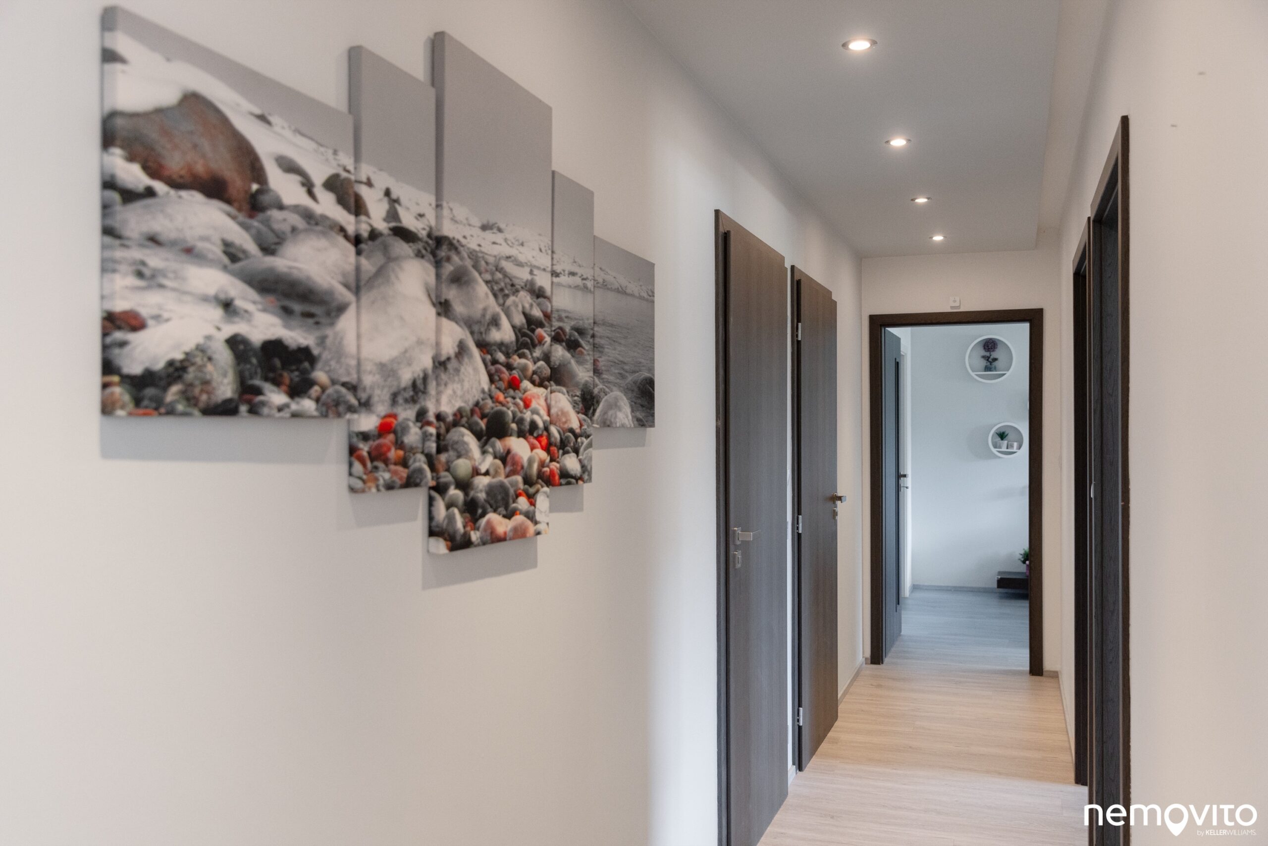 Teď se přesuneme do zóny s pokoji. Všechny jsou přístupné přes centrální chodbu a nejsou tedy průchozí.