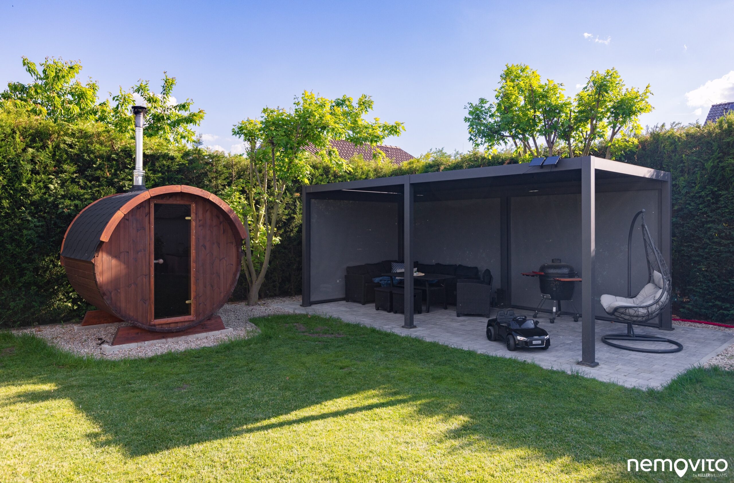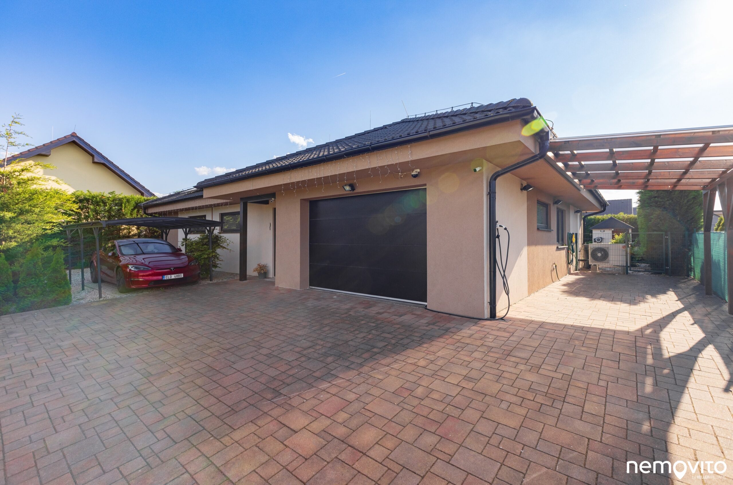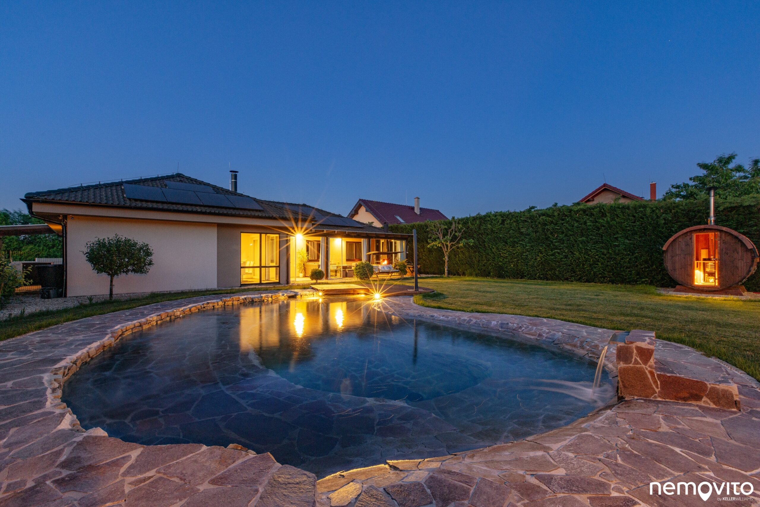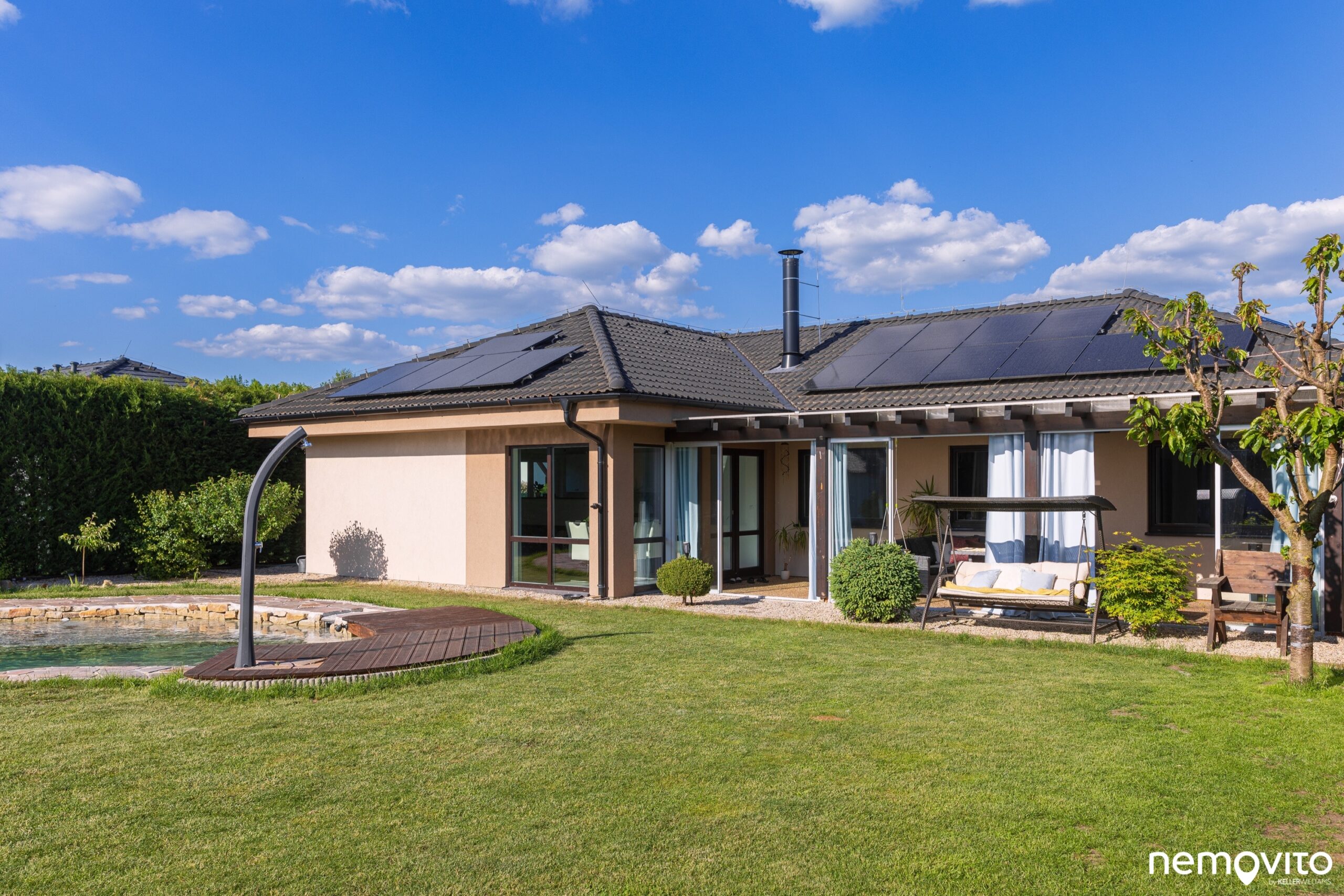 Dispozice 4+kk s obrovskou zimní zahradou, jedno auto do garáže, jedno z boku pod přístřešek a druhé pak na nabíječku. Dům nadšence do technologií a úspor rozeznáte na první pohled, tady šlo ale také o maximální komfort a skvělé zázemí pro rodinu. V domě nechybí dvě koupelny a skutečně velký obývák, jehož plocha je 46 m2. V létě na něj dost možná zapomenete, protože posedí buď ve 30 metrové zimní zahradě a nebo pod novou hliníkovou pergolou u sauny. Až z toho běhá hlava kolem. Dám si kafe tady nebo tamhle? Vyzkoušet ho vás necháme kdekoliv a věříme, že zklamaní skutečně nebudete. Jednou z nejlepších vlastností domu je však míra soukromí. Kolem dokola vysoký živý plot a příjemná velikost pozemku, který má skoro 1.000 m2. Ten bude něčím hlavně pro milovníky sluníčka. Ze svou západní orientací si ho budete užívat po celý den. A až bude sluníčka příliš, v domě si pustíte klimatizaci nebo si dáte skleničku v novém jezírku, které vypadá jednoduše fantasticky.