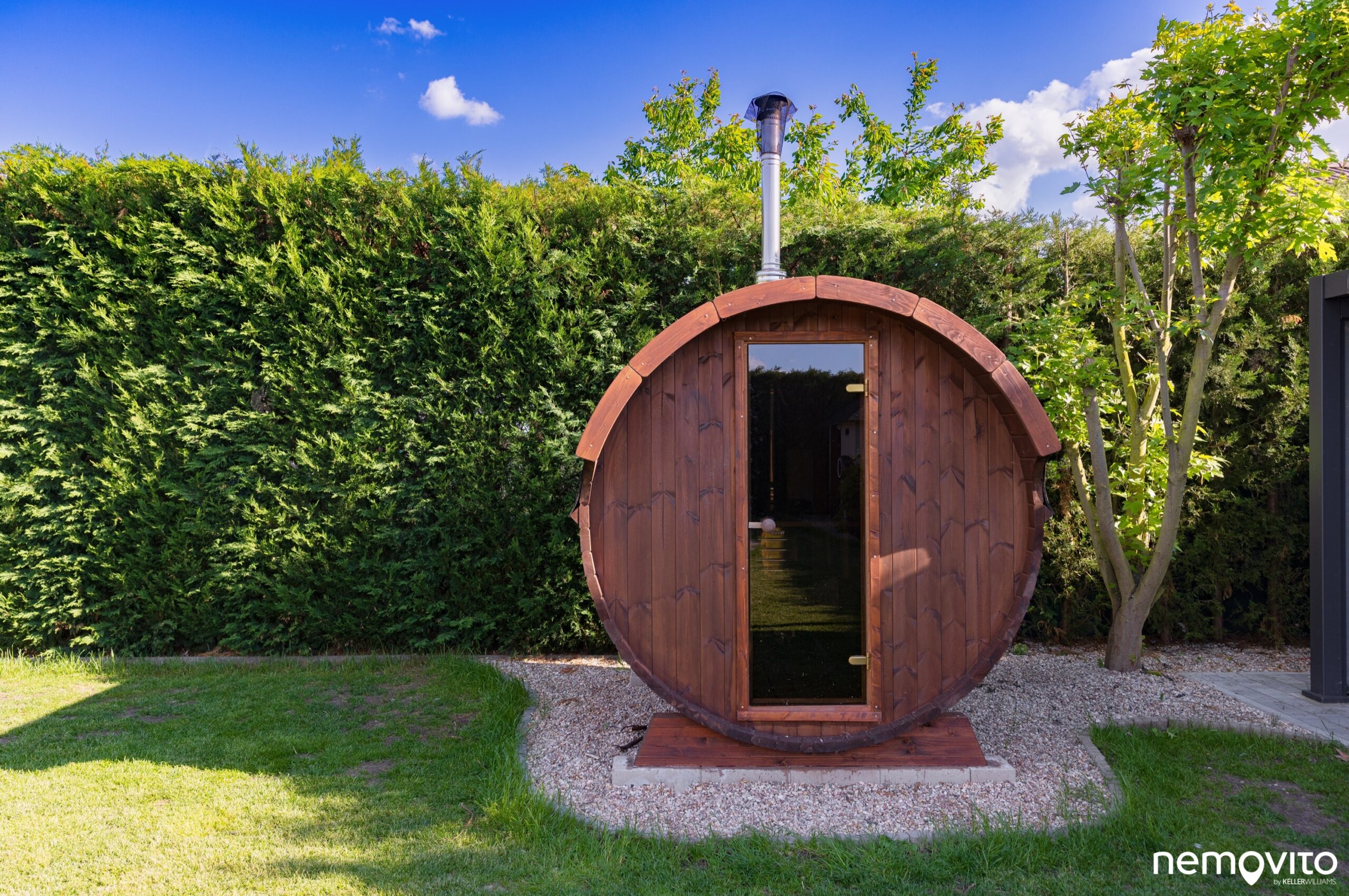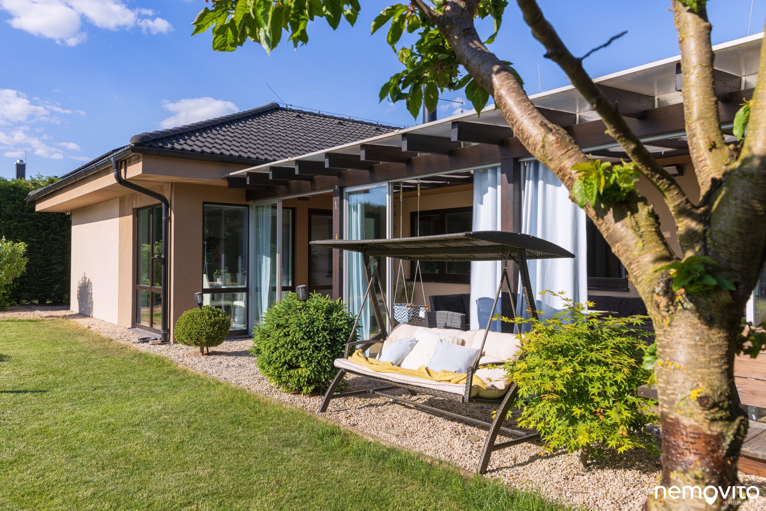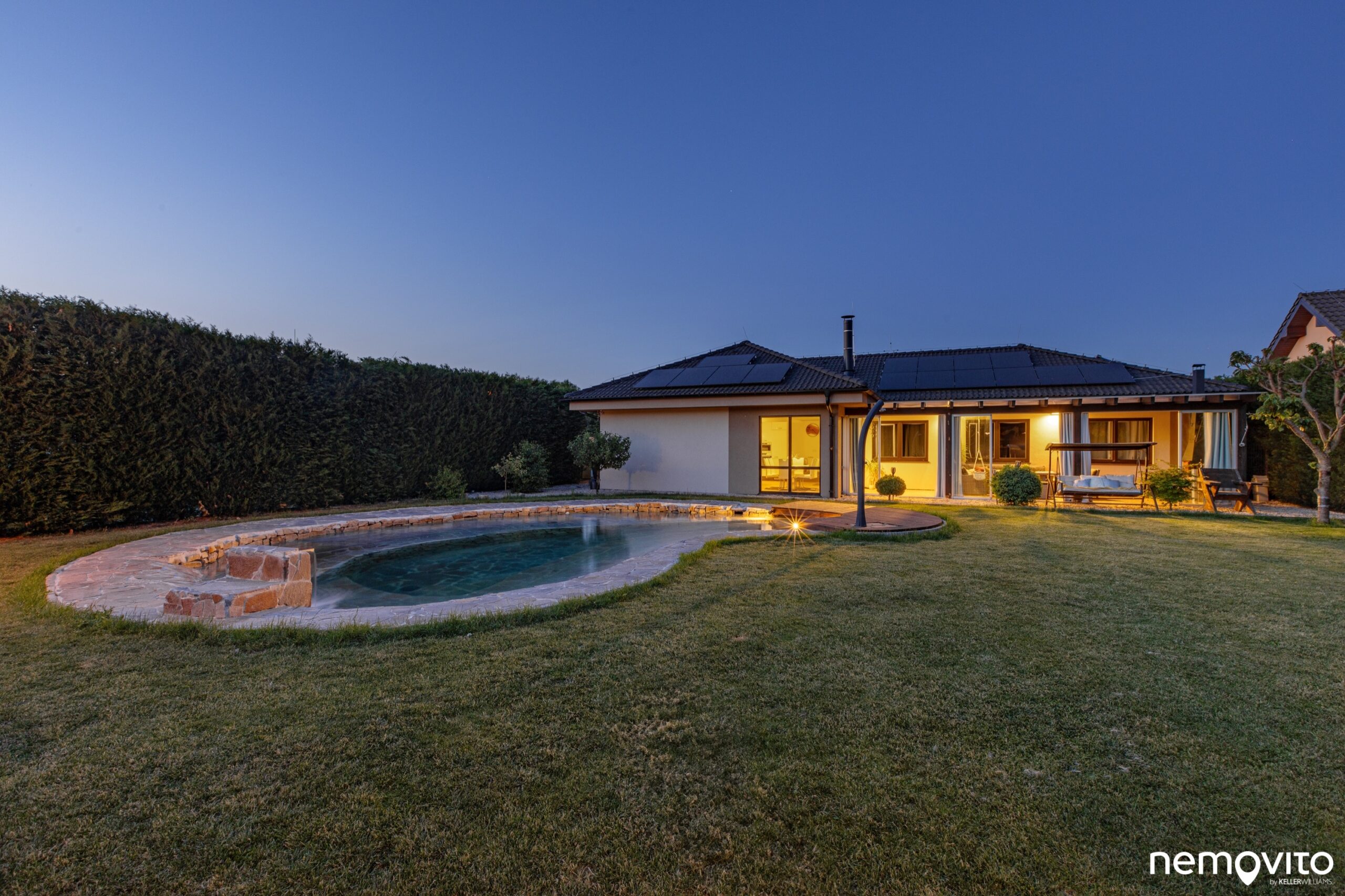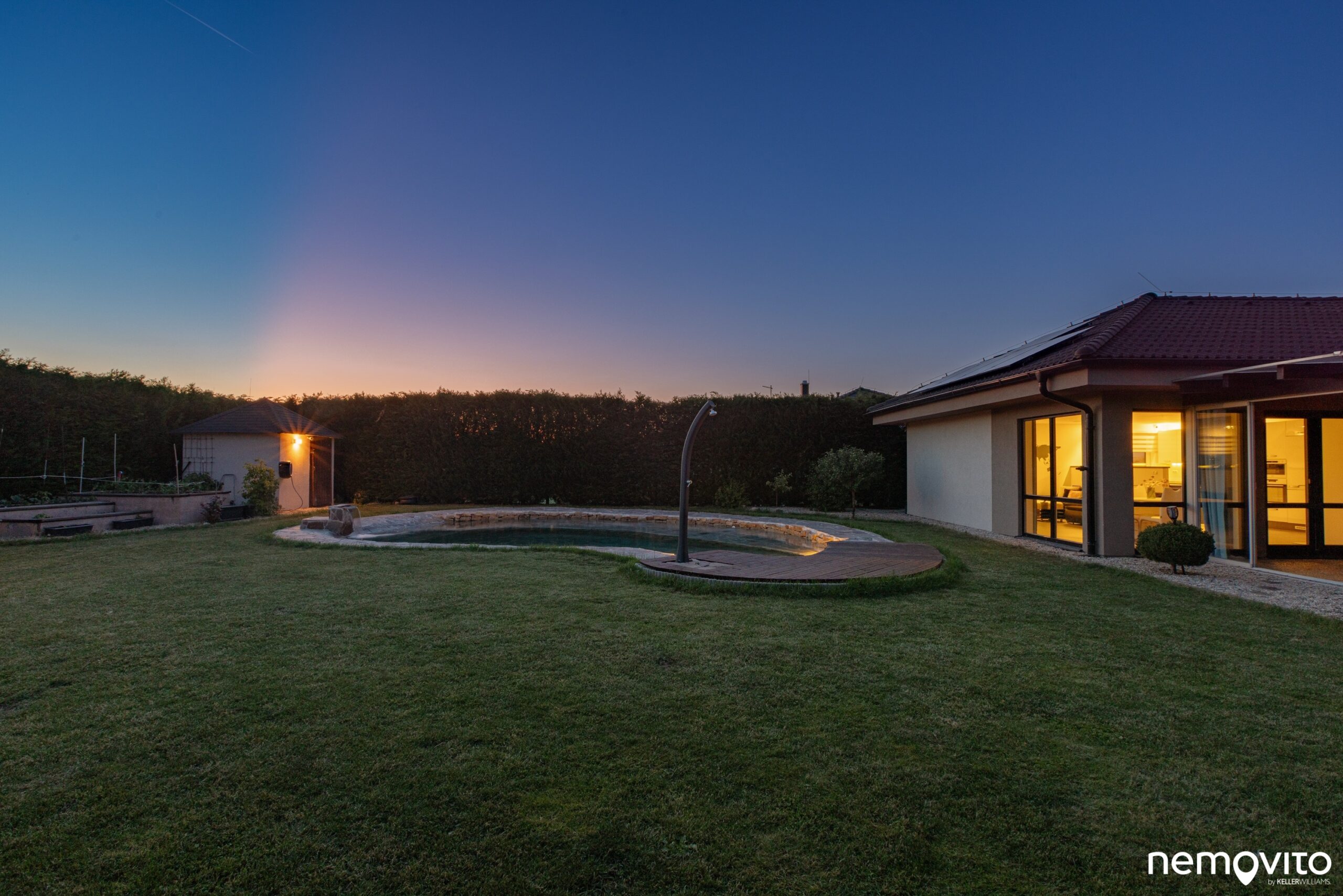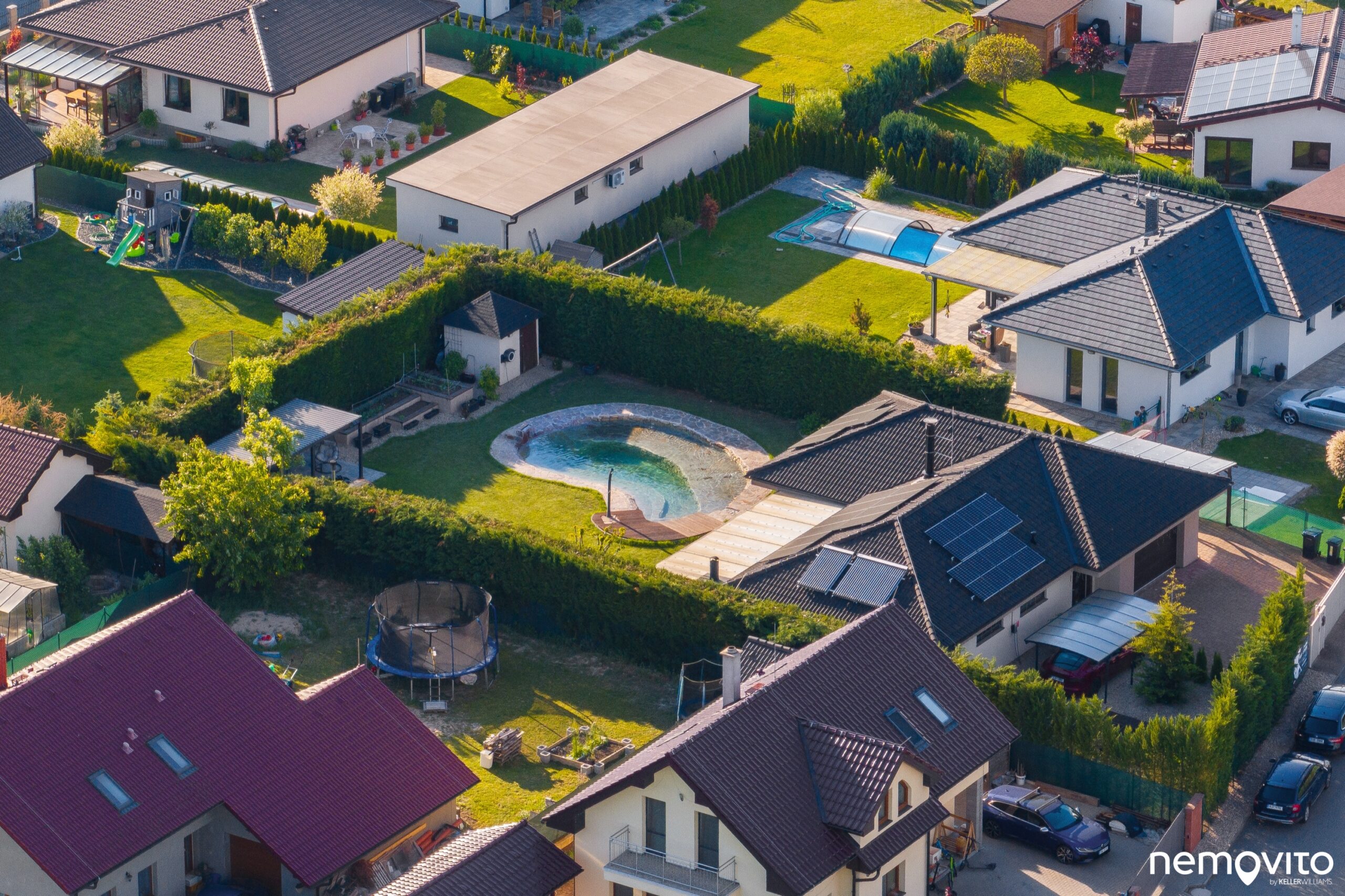 Dispozice 4+kk s obrovskou zimní zahradou, jedno auto do garáže, jedno z boku pod přístřešek a druhé pak na nabíječku. Dům nadšence do technologií a úspor rozeznáte na první pohled, tady šlo ale také o maximální komfort a skvělé zázemí pro rodinu. V domě nechybí dvě koupelny a skutečně velký obývák, jehož plocha je 46 m2. V létě na něj dost možná zapomenete, protože posedí buď ve 30 metrové zimní zahradě a nebo pod novou hliníkovou pergolou u sauny. Až z toho běhá hlava kolem. Dám si kafe tady nebo tamhle? Vyzkoušet ho vás necháme kdekoliv a věříme, že zklamaní skutečně nebudete. Jednou z nejlepších vlastností domu je však míra soukromí. Kolem dokola vysoký živý plot a příjemná velikost pozemku, který má skoro 1.000 m2. Ten bude něčím hlavně pro milovníky sluníčka. Ze svou západní orientací si ho budete užívat po celý den. A až bude sluníčka příliš, v domě si pustíte klimatizaci nebo si dáte skleničku v novém jezírku, které vypadá jednoduše fantasticky.