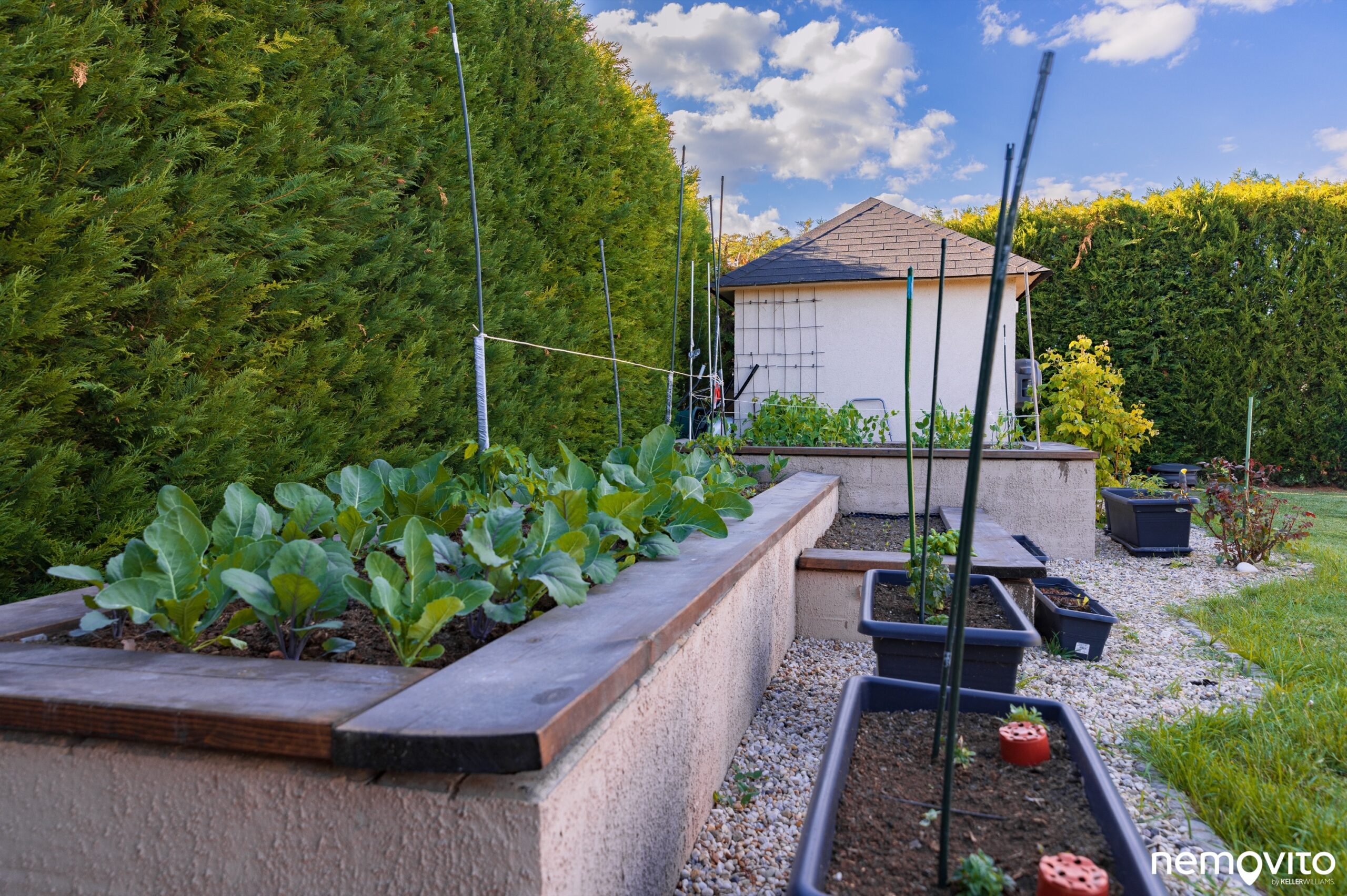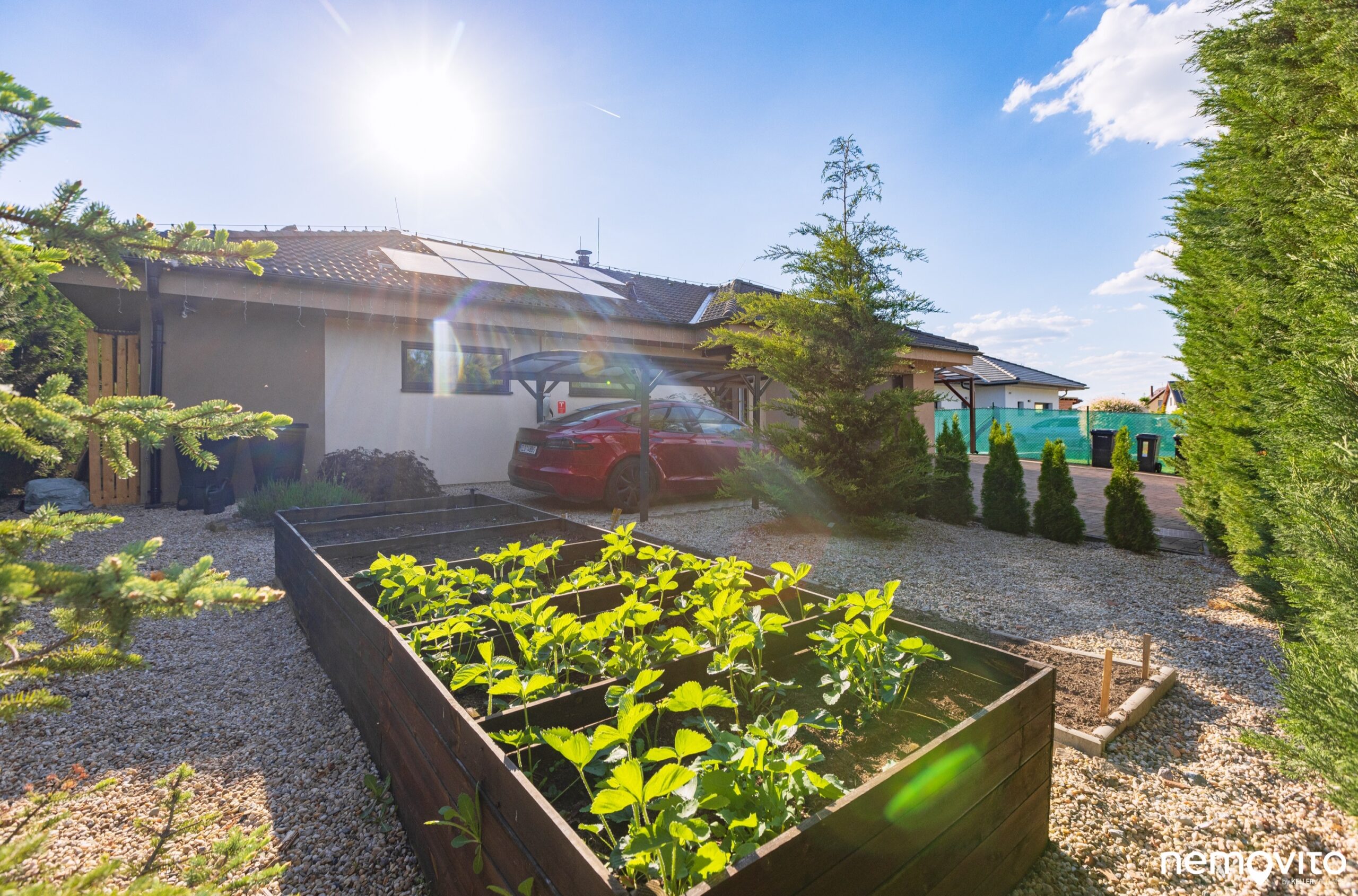 Mezi pergolou a zahradním domkem vás pak čekají ještě vyvýšené záhonky užitkové části zahrádky. Ta má svůj prostor také před domem u stání pro auto.