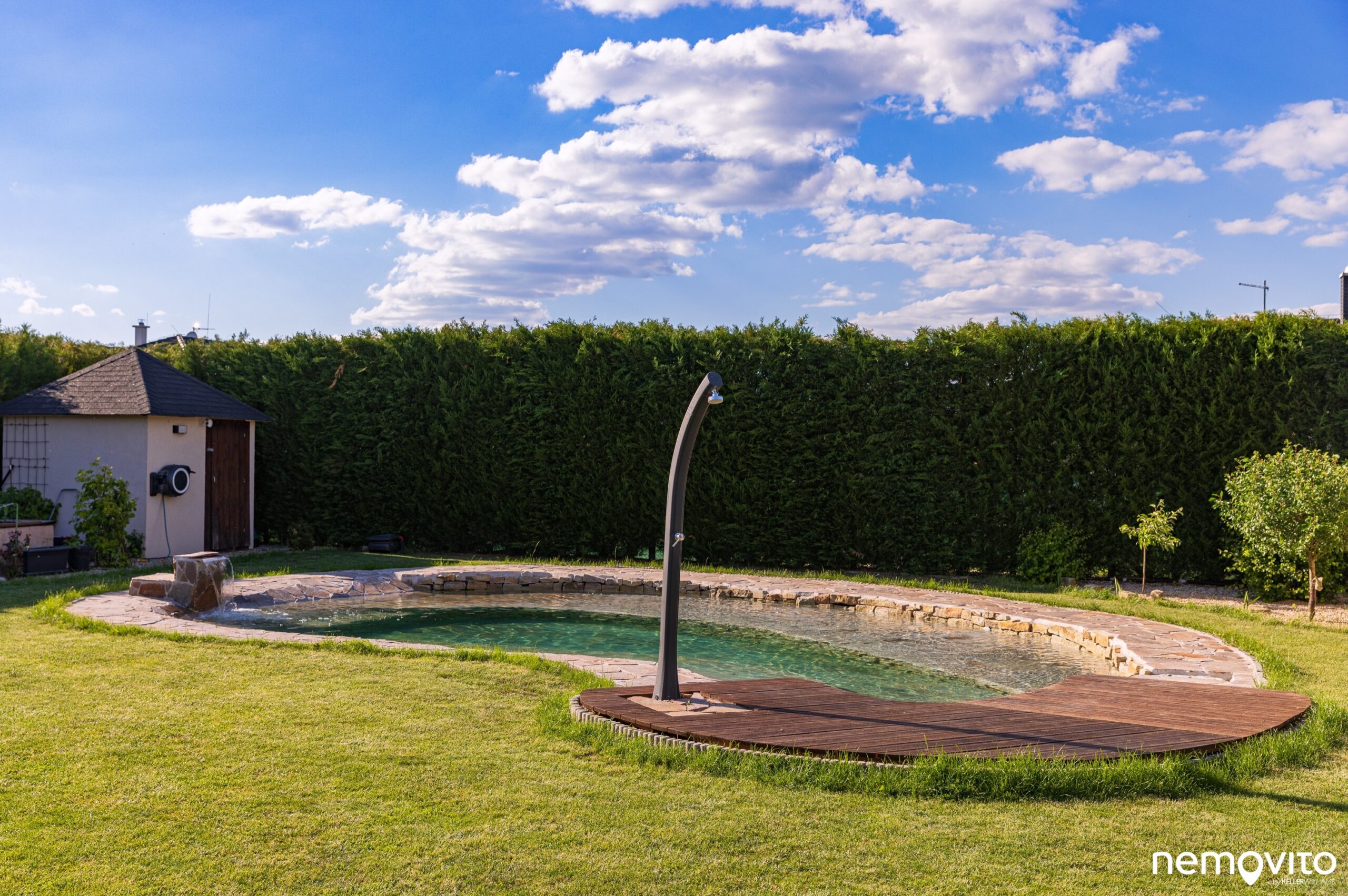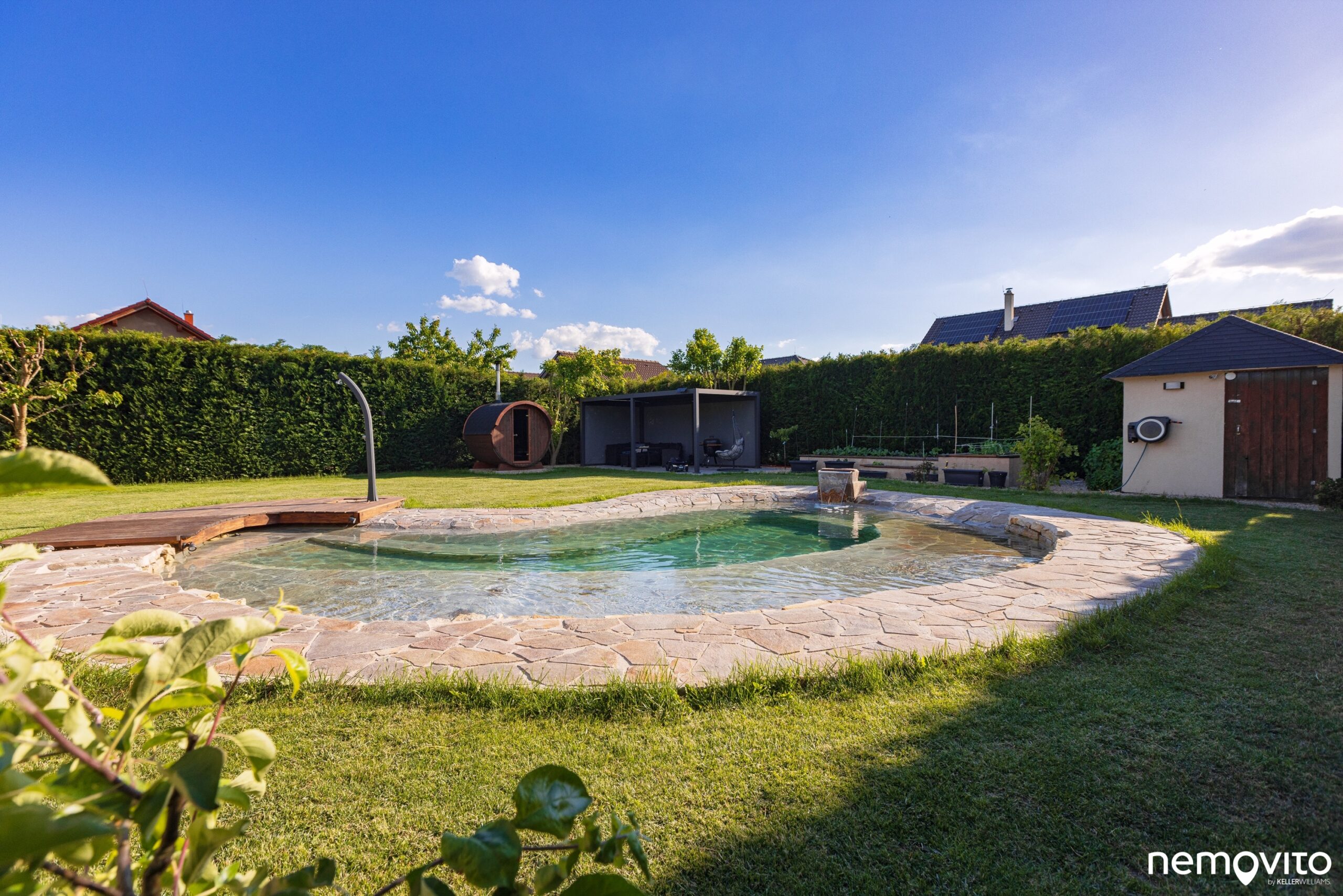 Velkou chloubou je nově vybudované kamenné jezírko (2023), které plní funkci bazénu. Akorát, že mnohem hezčího. Žádné ošklivé plastové vany.