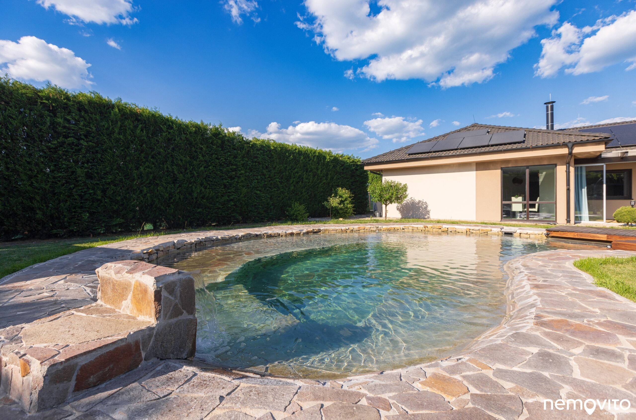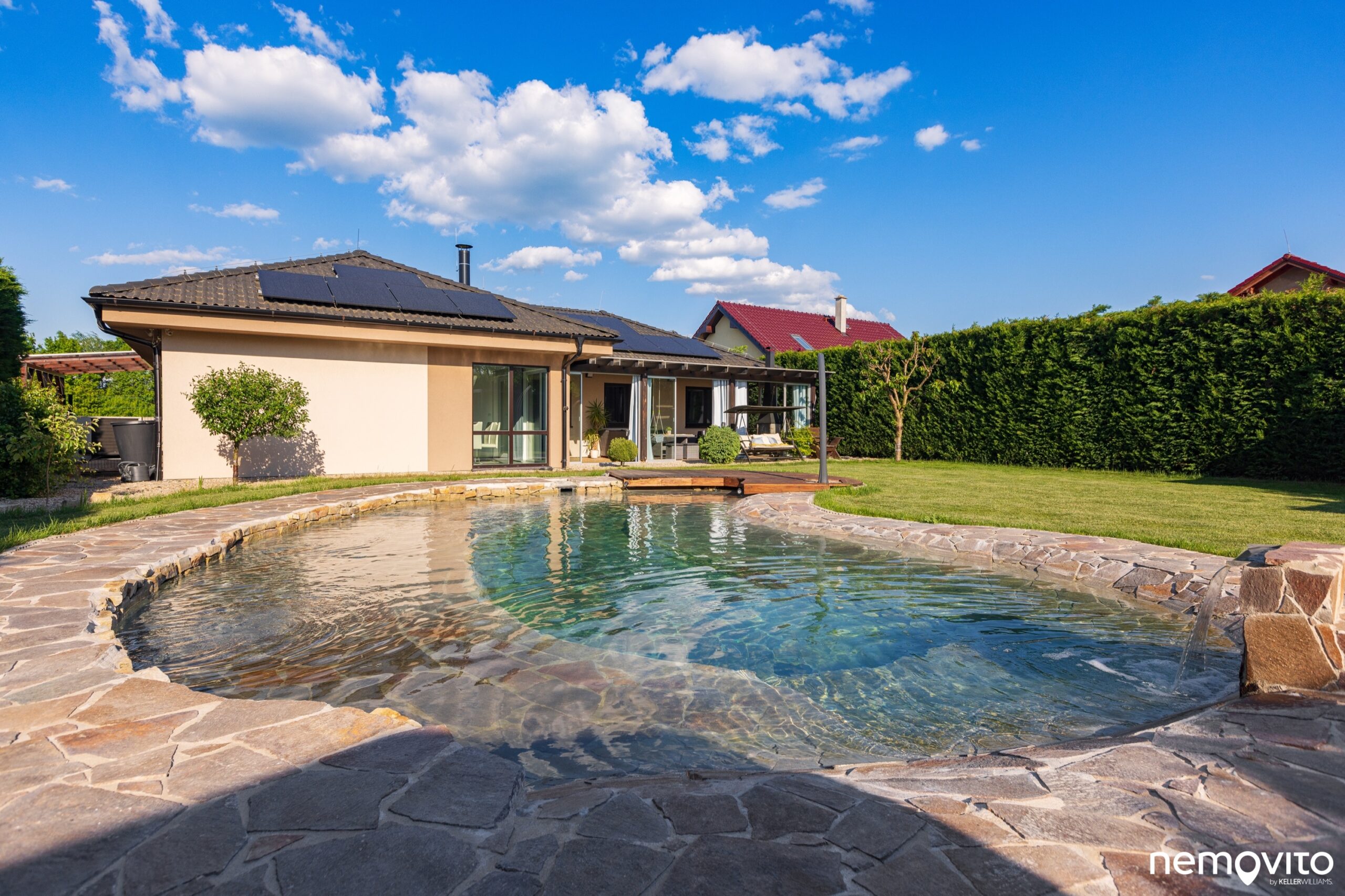 Jezírko bylo budováno s ohledem na prcky, takže v sobě ukrývá několik úrovní hloubky. Díky kamenům i mělké části se voda krásně prohřeje. Na domě si můžete povšimnout panelů nově nainstalované (2024) FVE o výkonu 9,35 kWp.