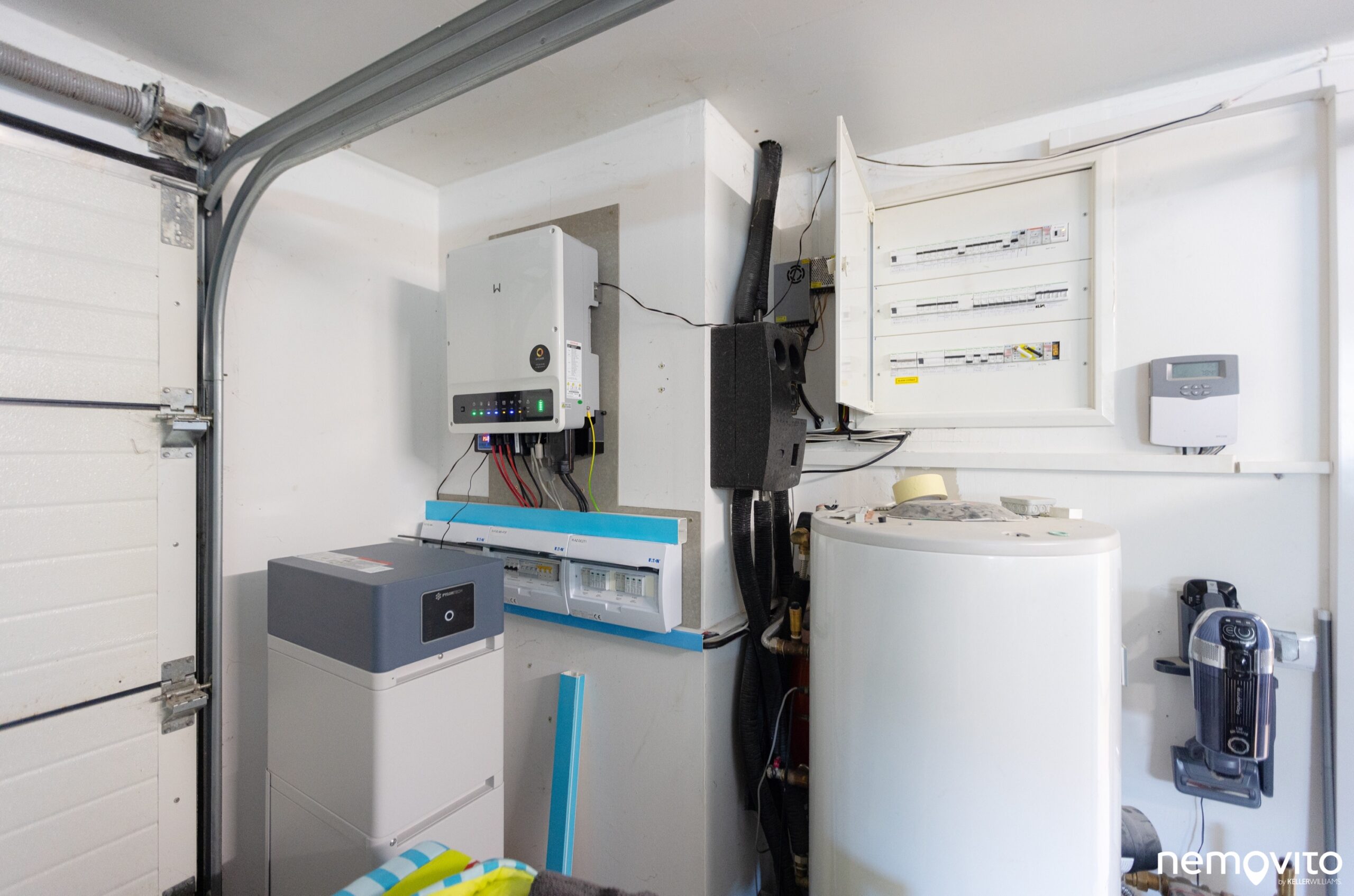 Garáž (30 m2) zevnitř vám dneska ukazovat nebudeme, někam jsme všechny ty věci dát museli! 🙂 Auto zaparkujete také z boku domu, kde je vytvořen přístřešek. Ale aspoň malá ochutnávka přichází z části, kde je tech. zázemí. Střídač napětí k FVE, bateriové úložiště (14 kWh) a akumulační nádrž na teplou vodu.