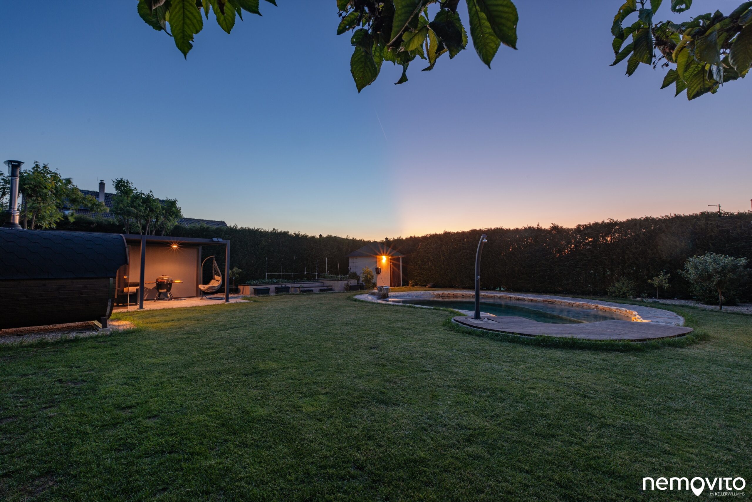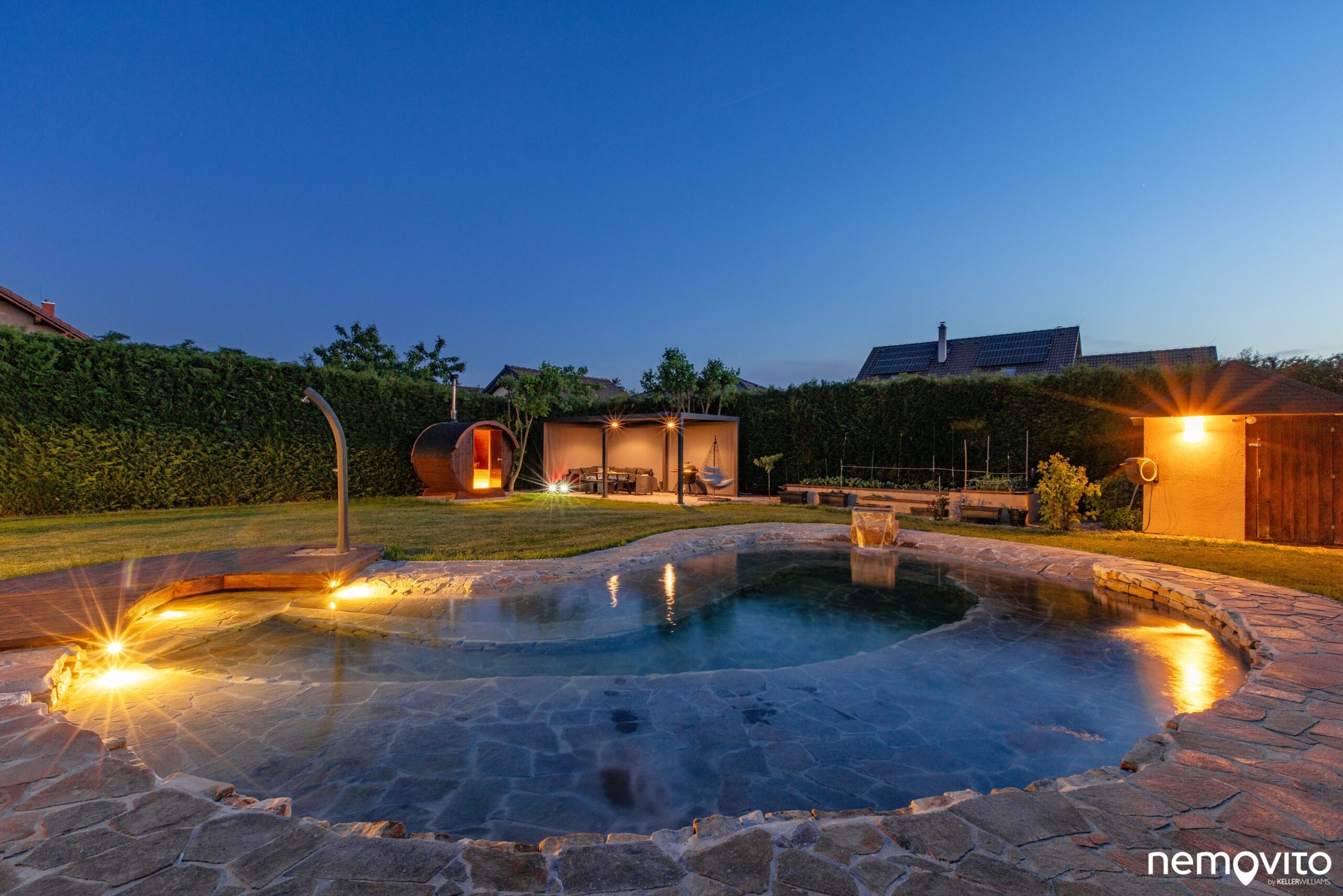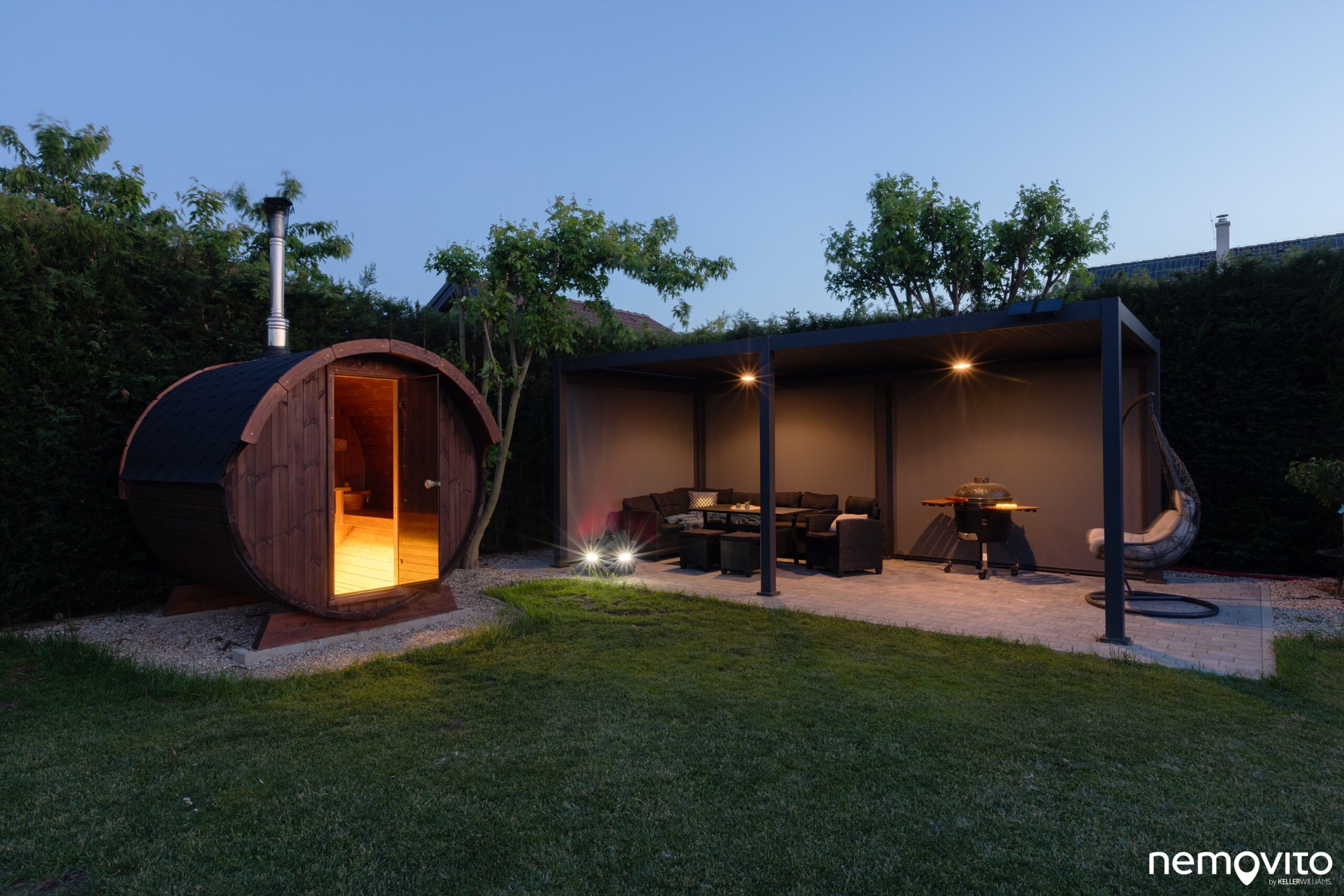 V rohu pozemku se mimo sauny nachází ještě hliníková pergola. Tenhle růžek pozemku vypadá fantasticky ve dne i v noci.