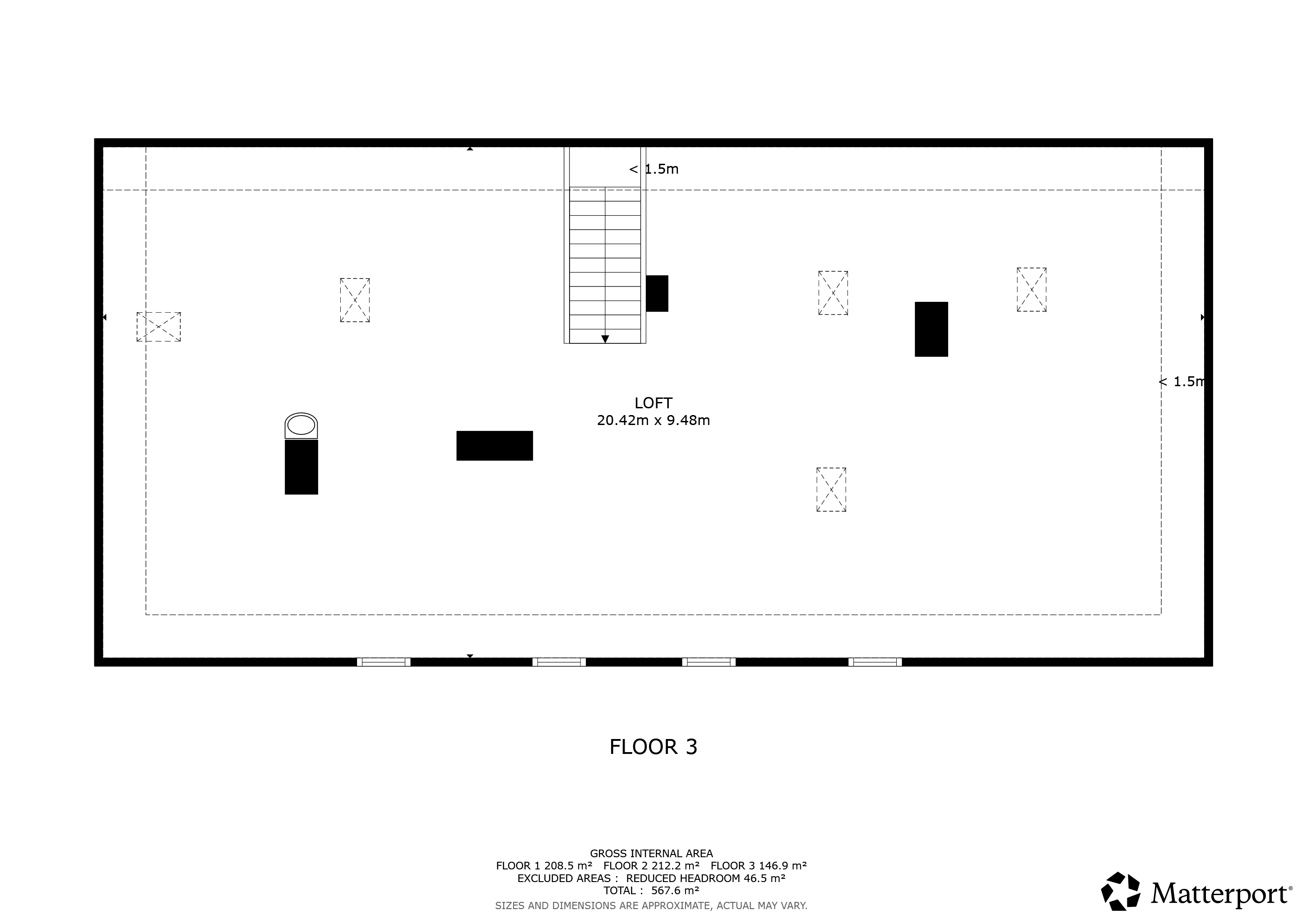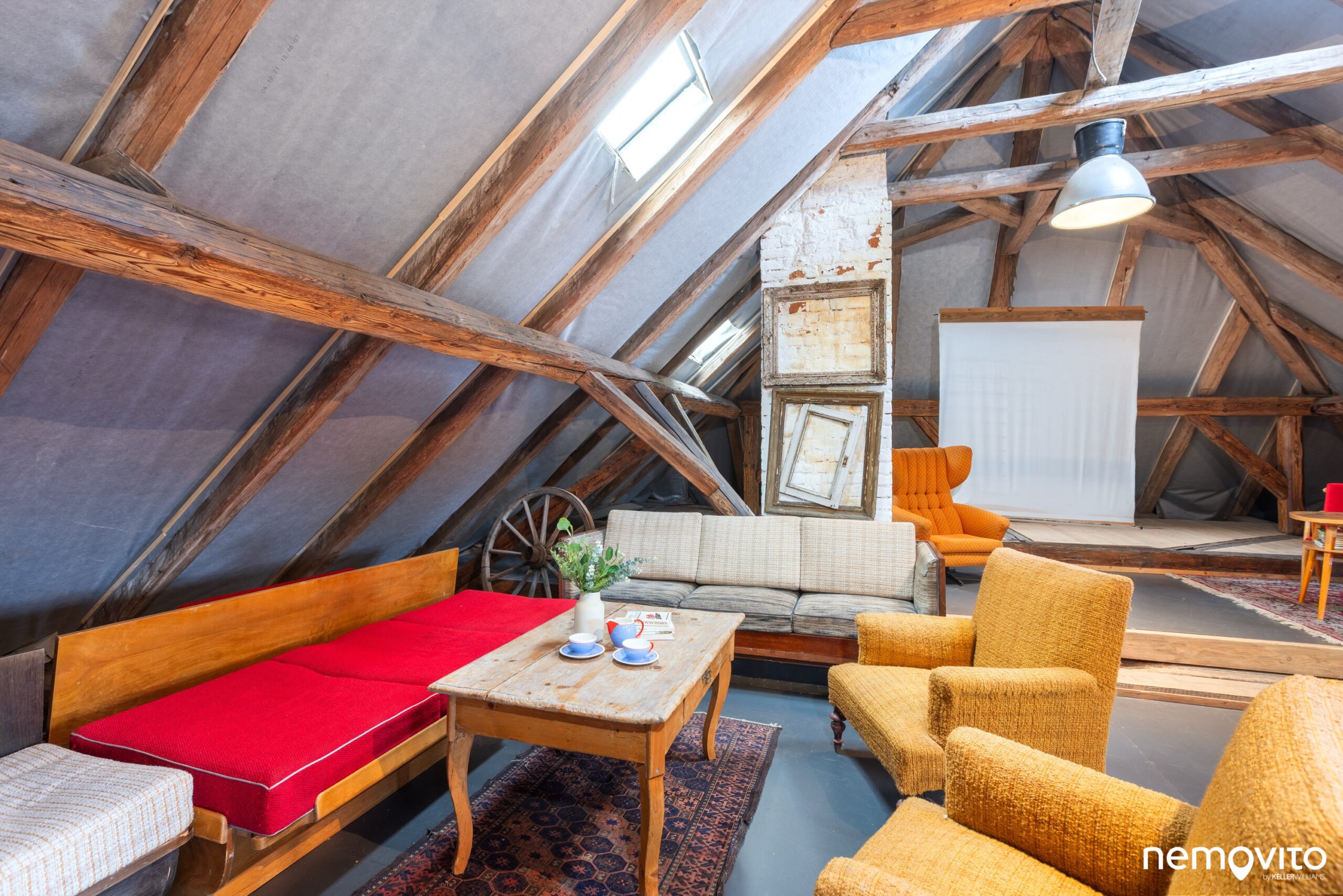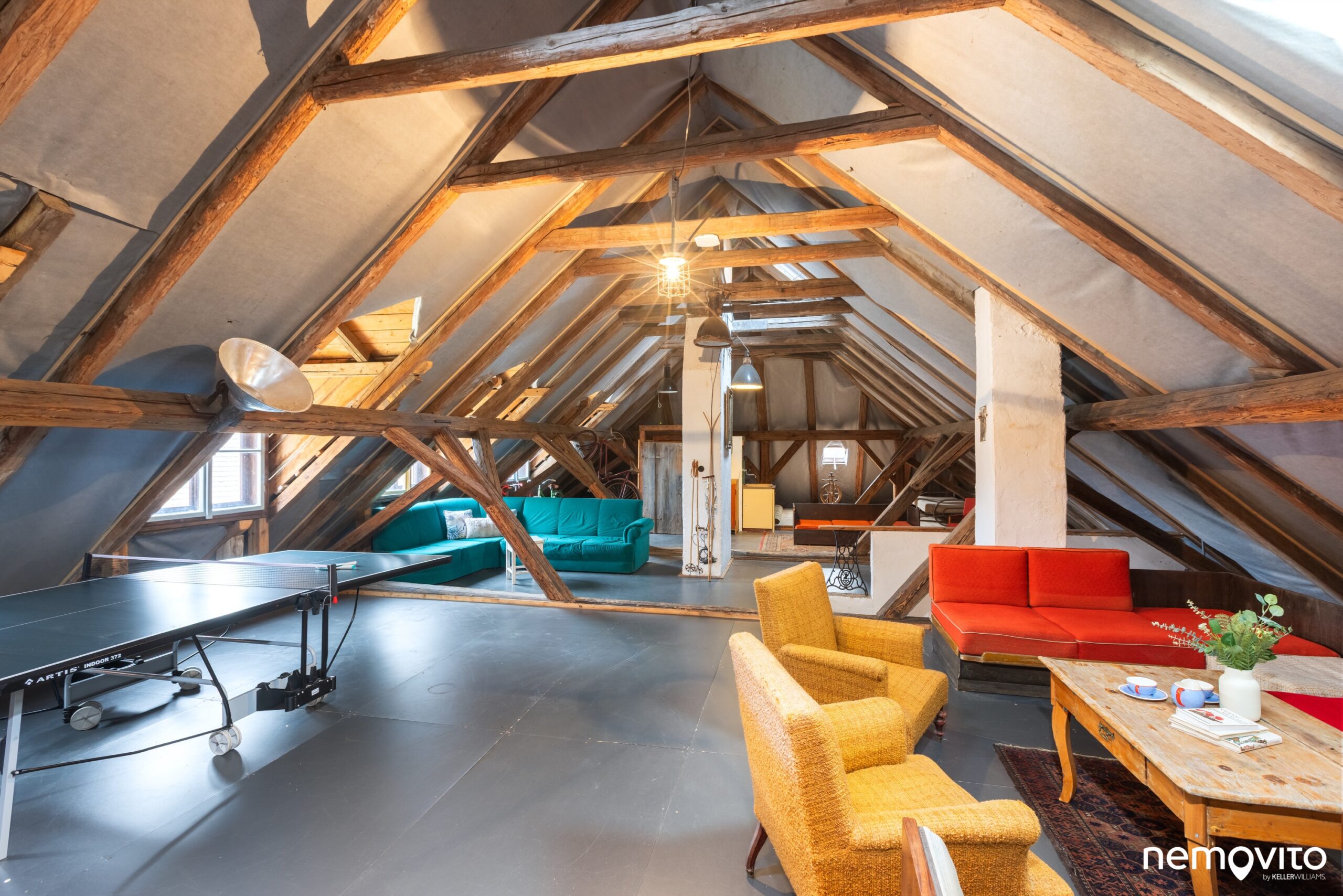 Poslední ozdobou domu je pak tato obří půda (cca 194 m2). Je nezateplená, ale čistá a suchá. Funguje hlavně v letní sezoně, kdy se ze společenské místnosti přesunete nahoru mezi trámy. Mimo místa na pinčes nebo posezení je tady taky plátno pro vaše soukromé kino.