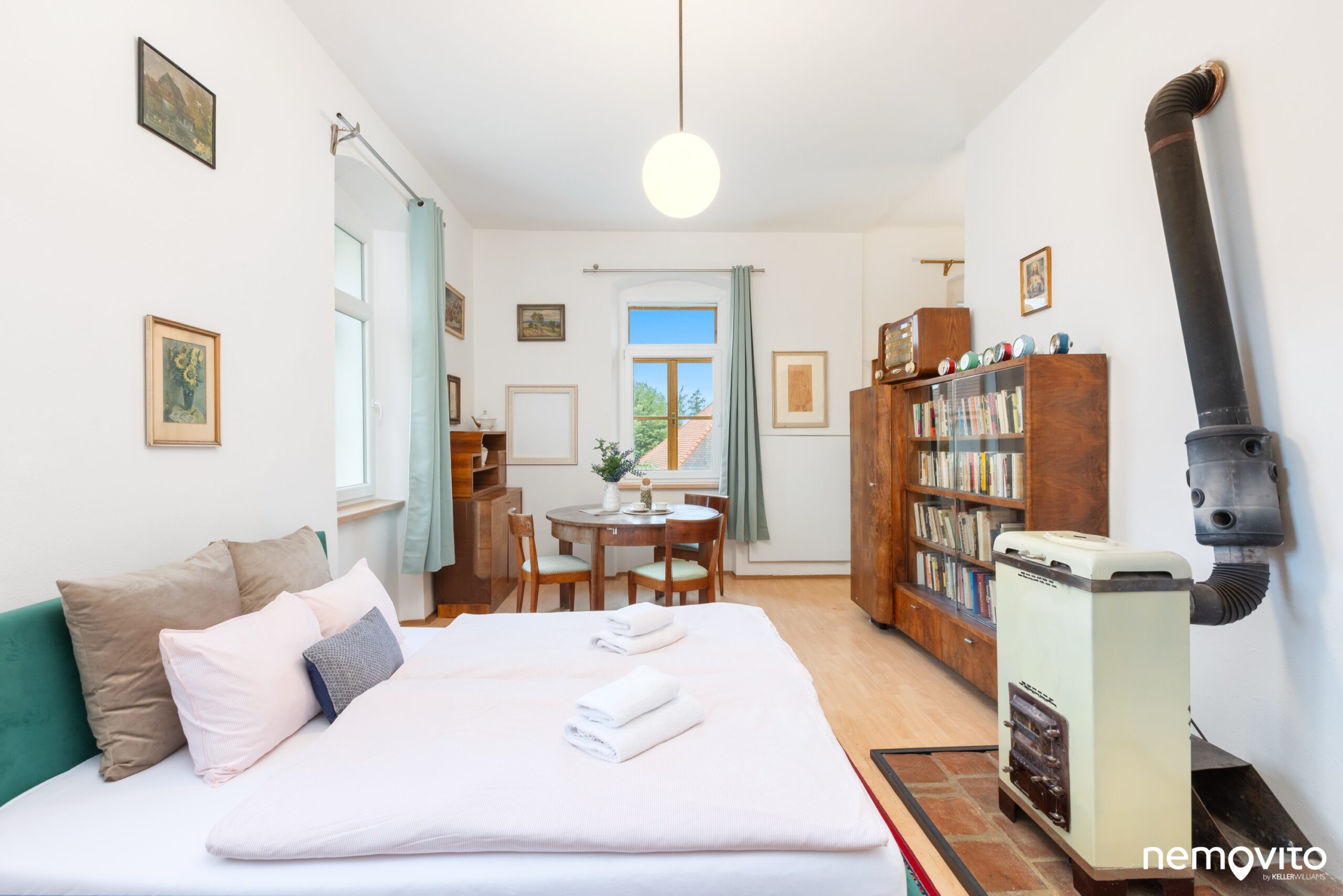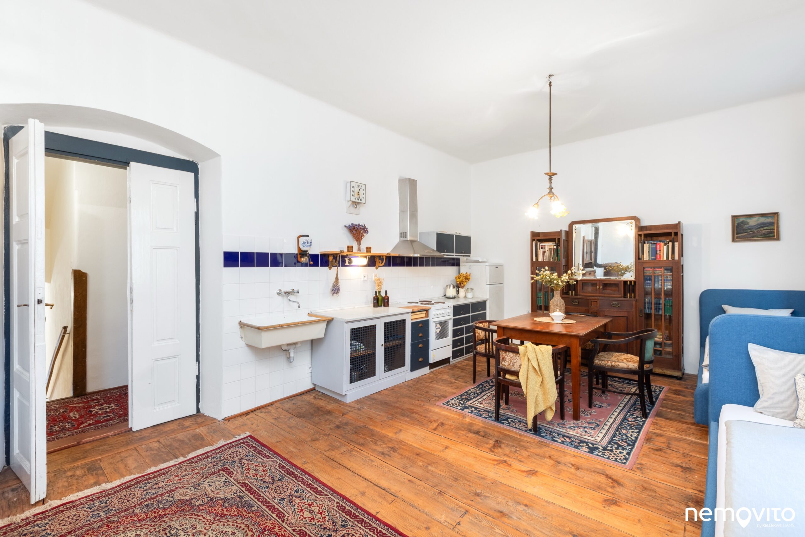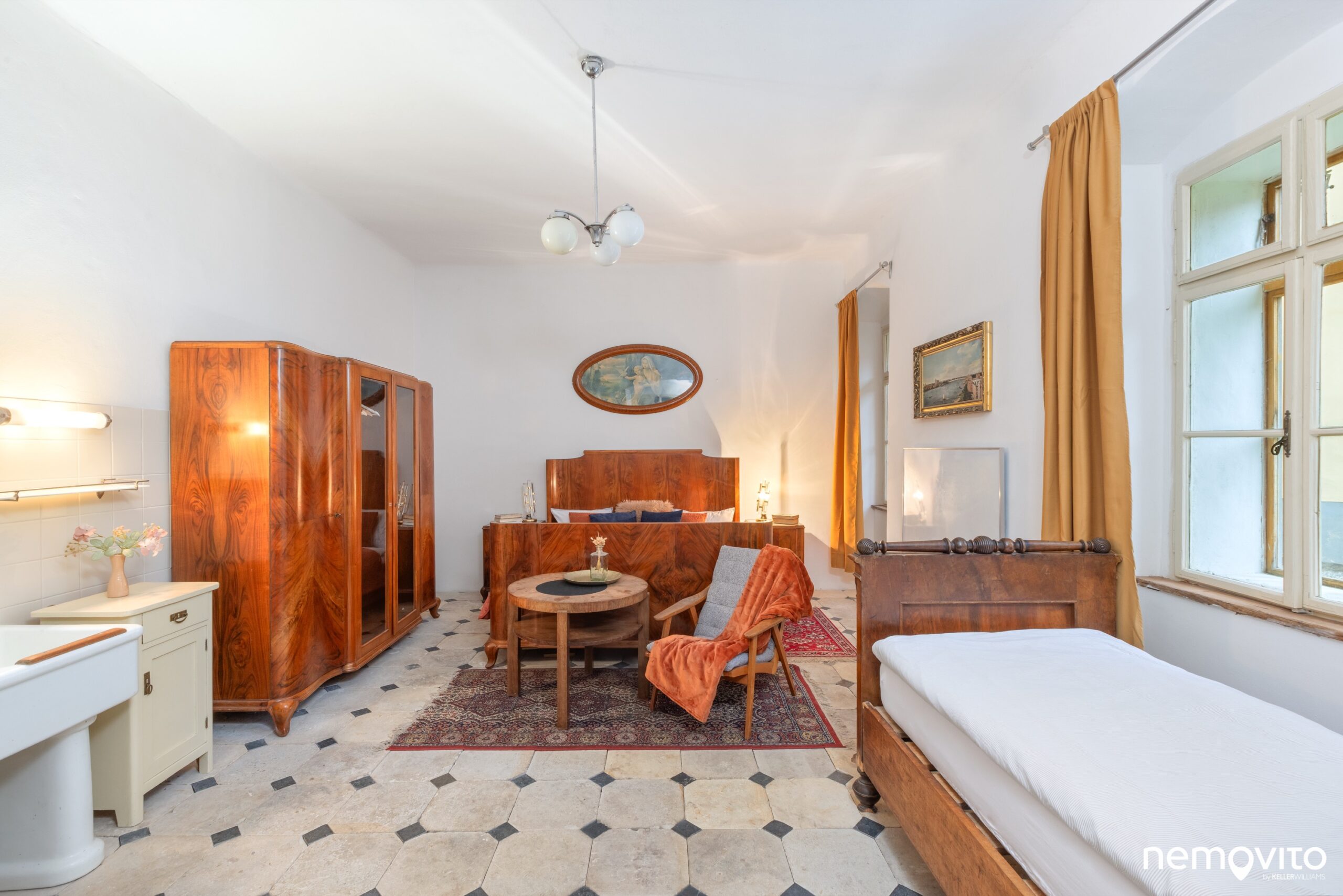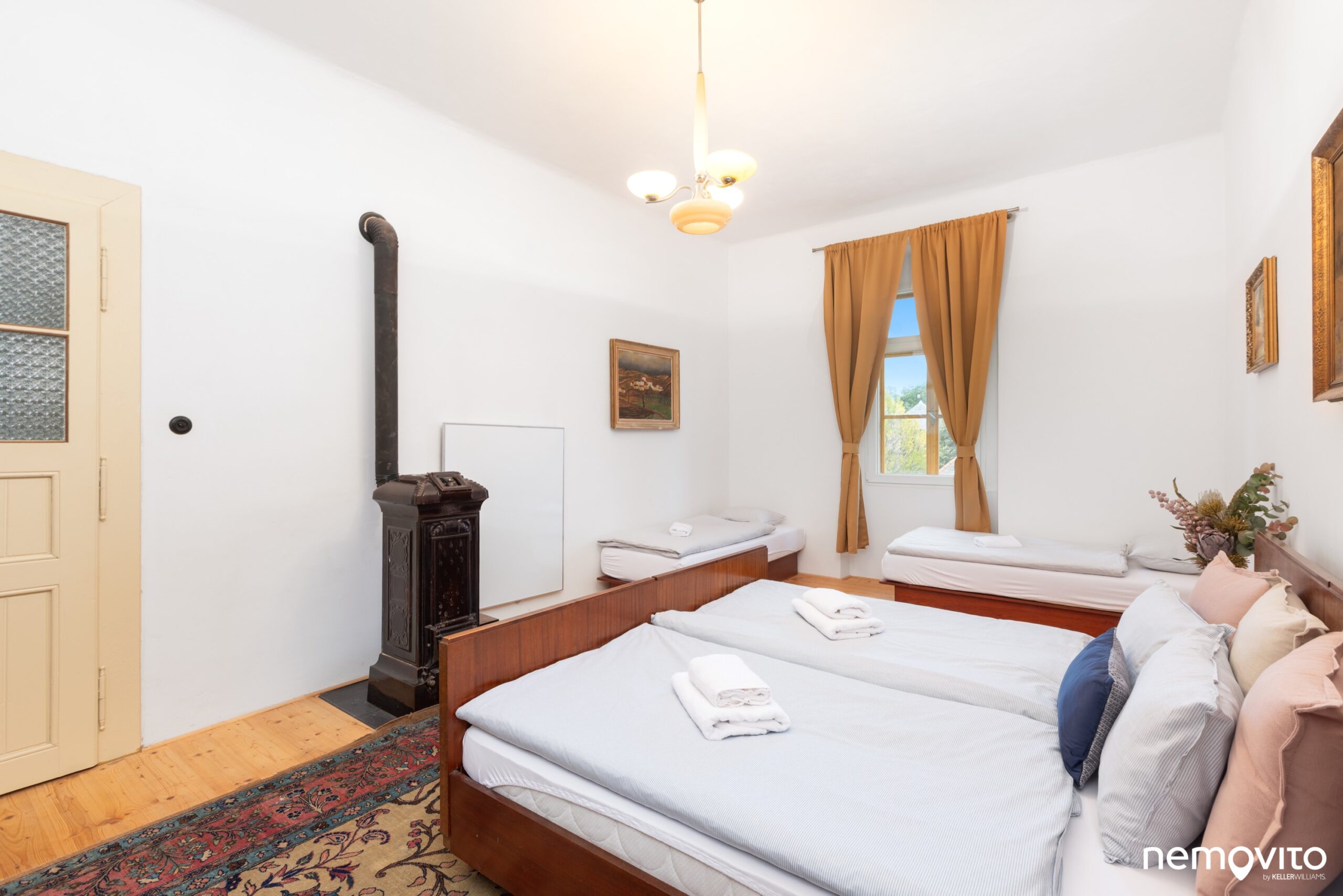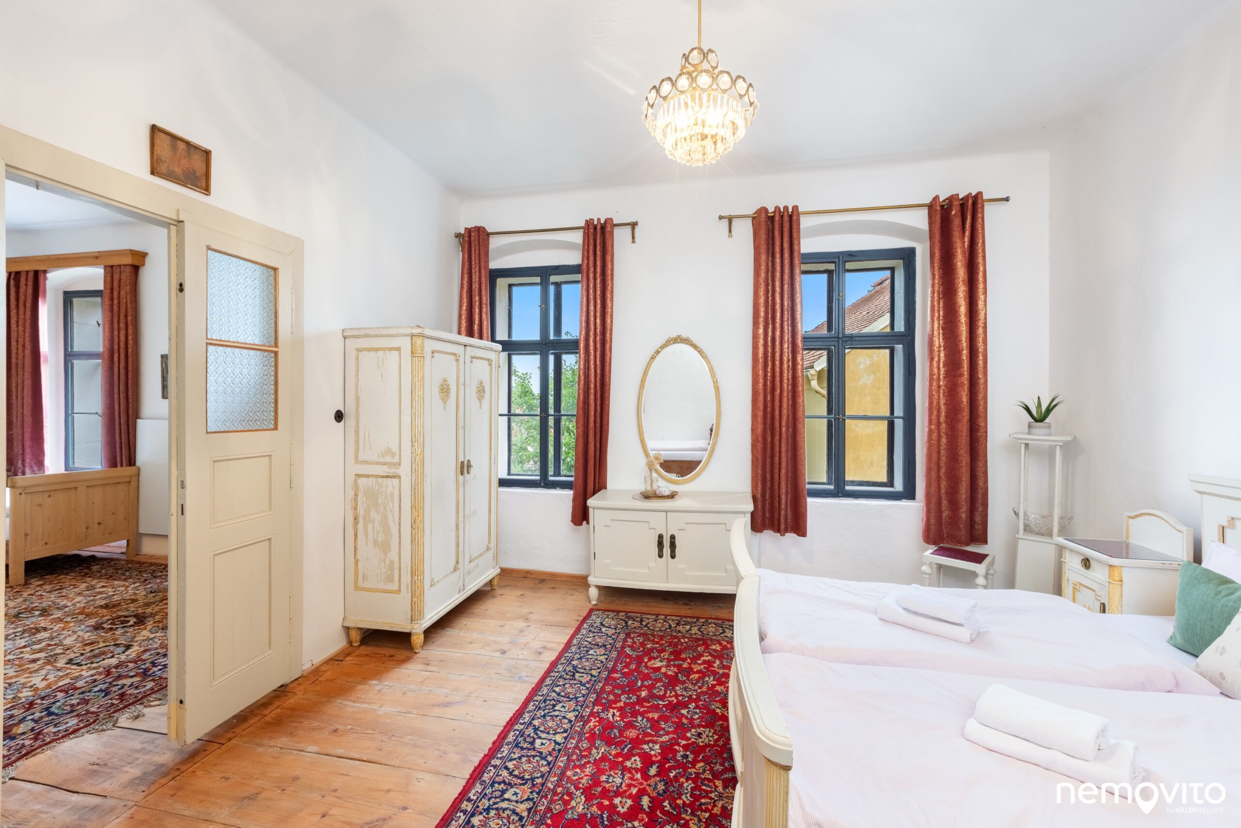 Křídlové dveře, dřevěné podlahy, vysoké stropy a velká okna. Skutečně jako na zámku, čemuž bylo uzpůsobeno i ladění vybavení.