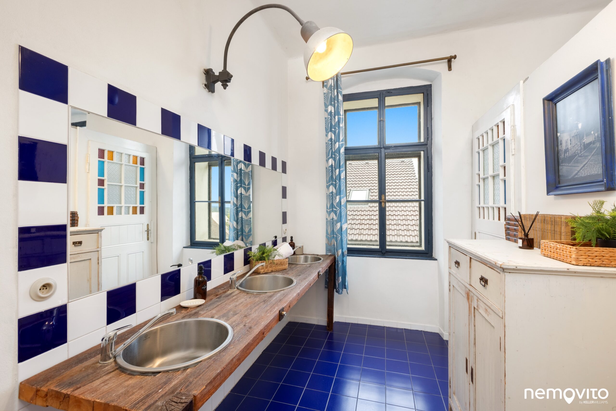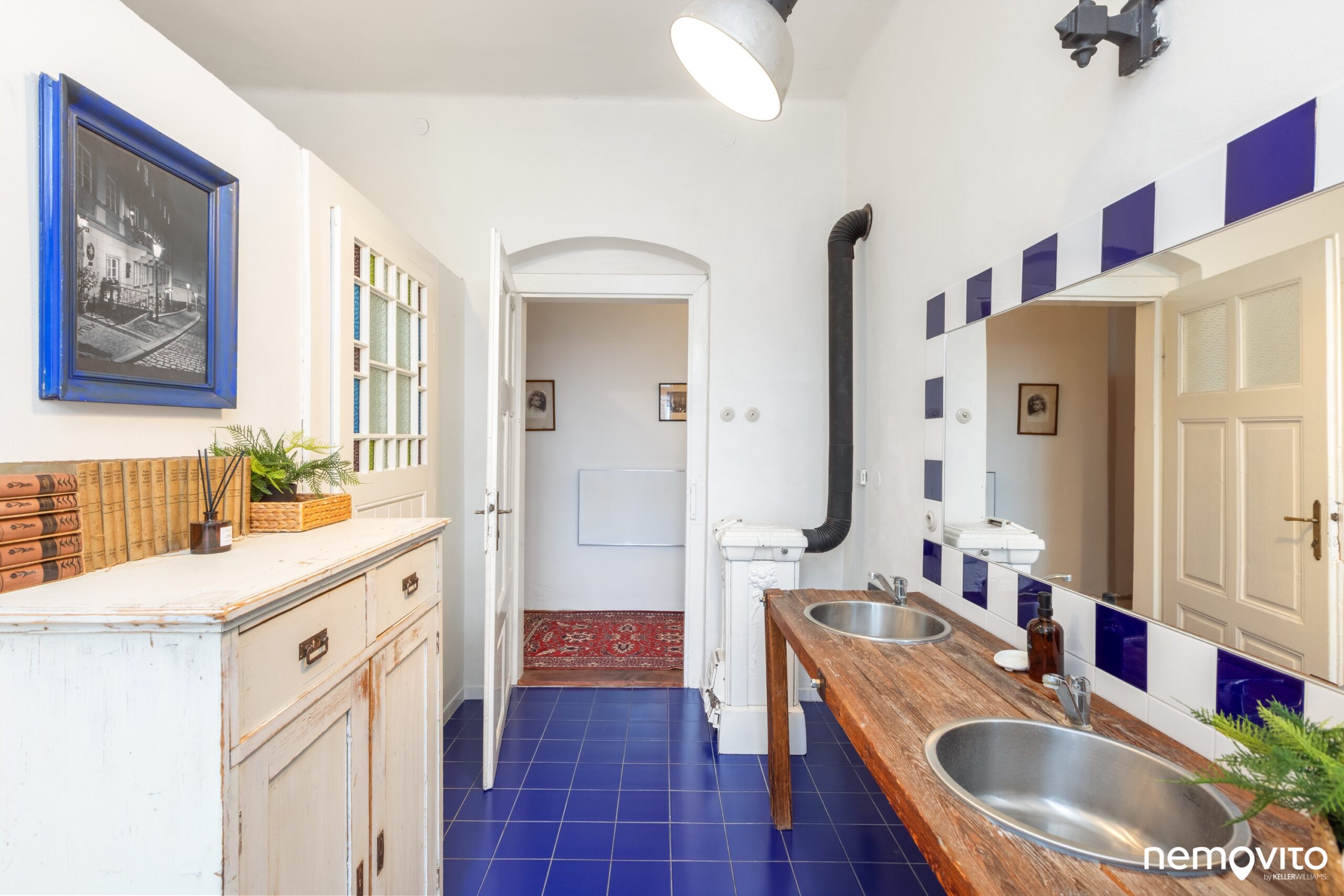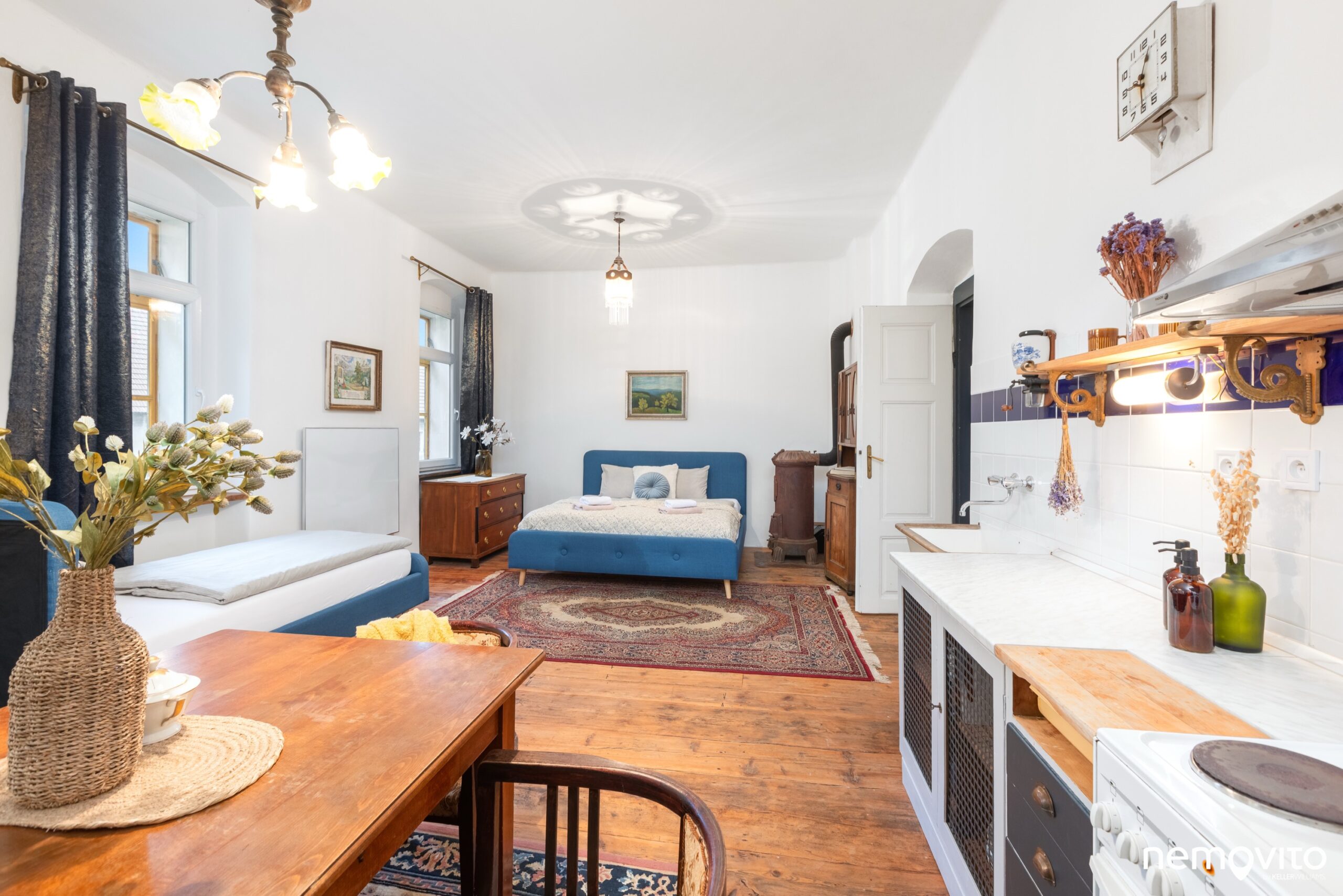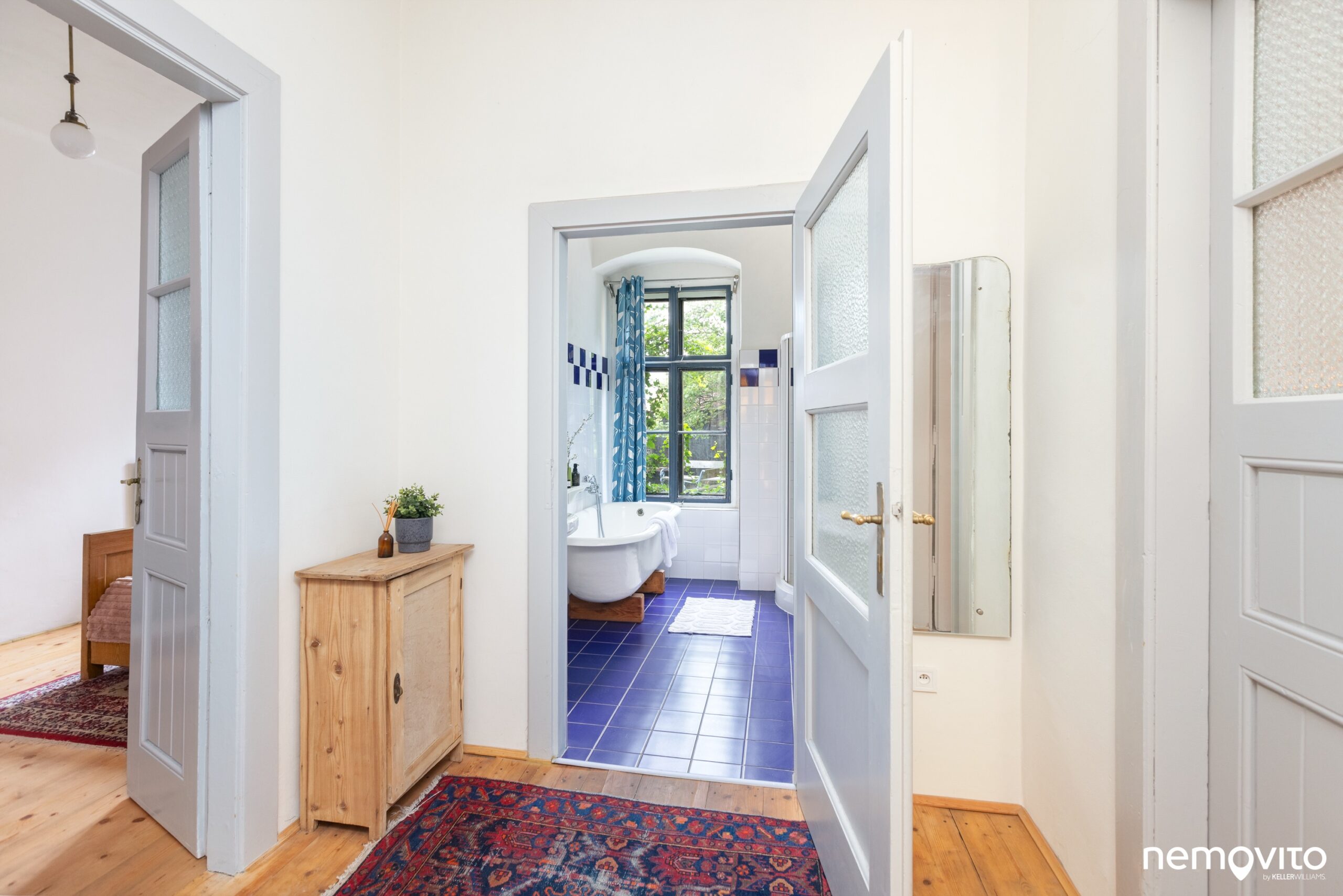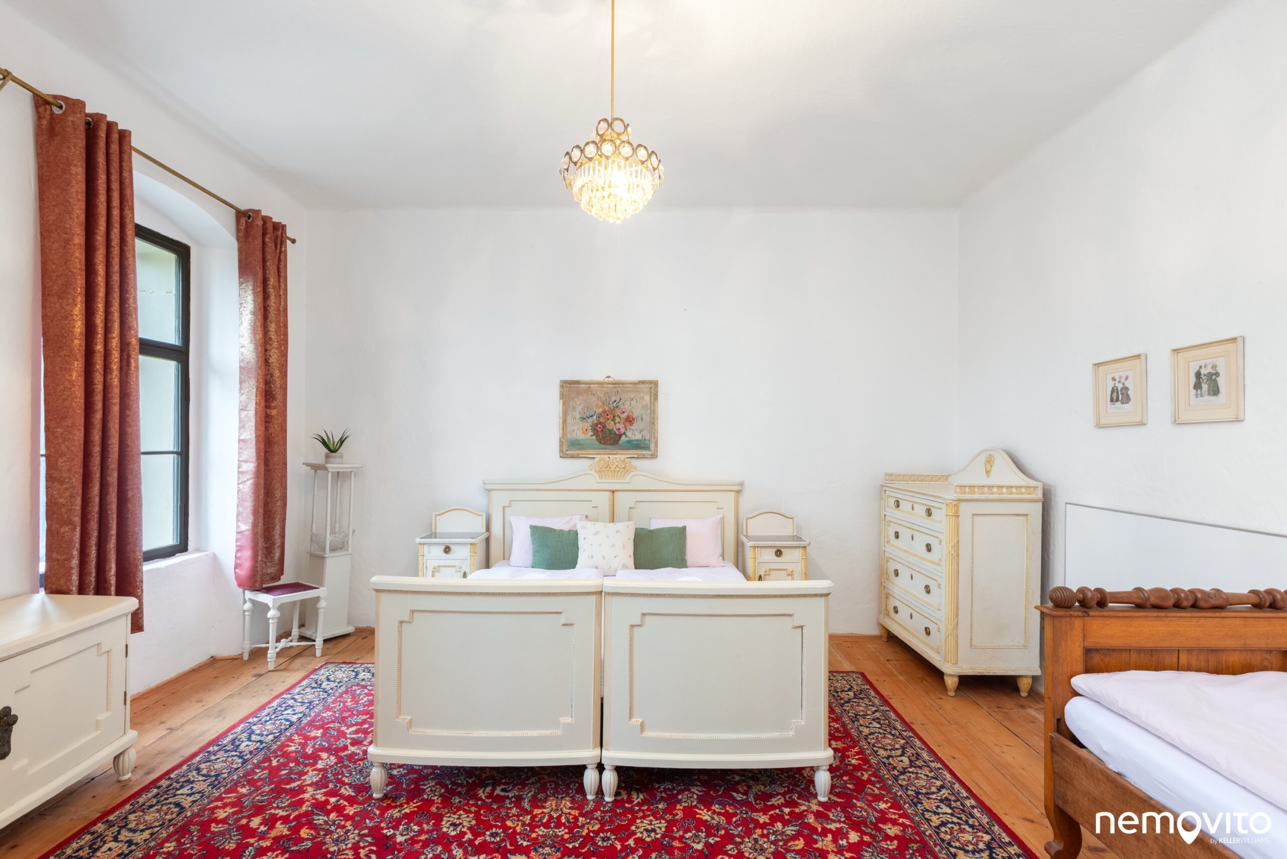 Křídlové dveře, dřevěné podlahy, vysoké stropy a velká okna. Skutečně jako na zámku, čemuž bylo uzpůsobeno i ladění vybavení.