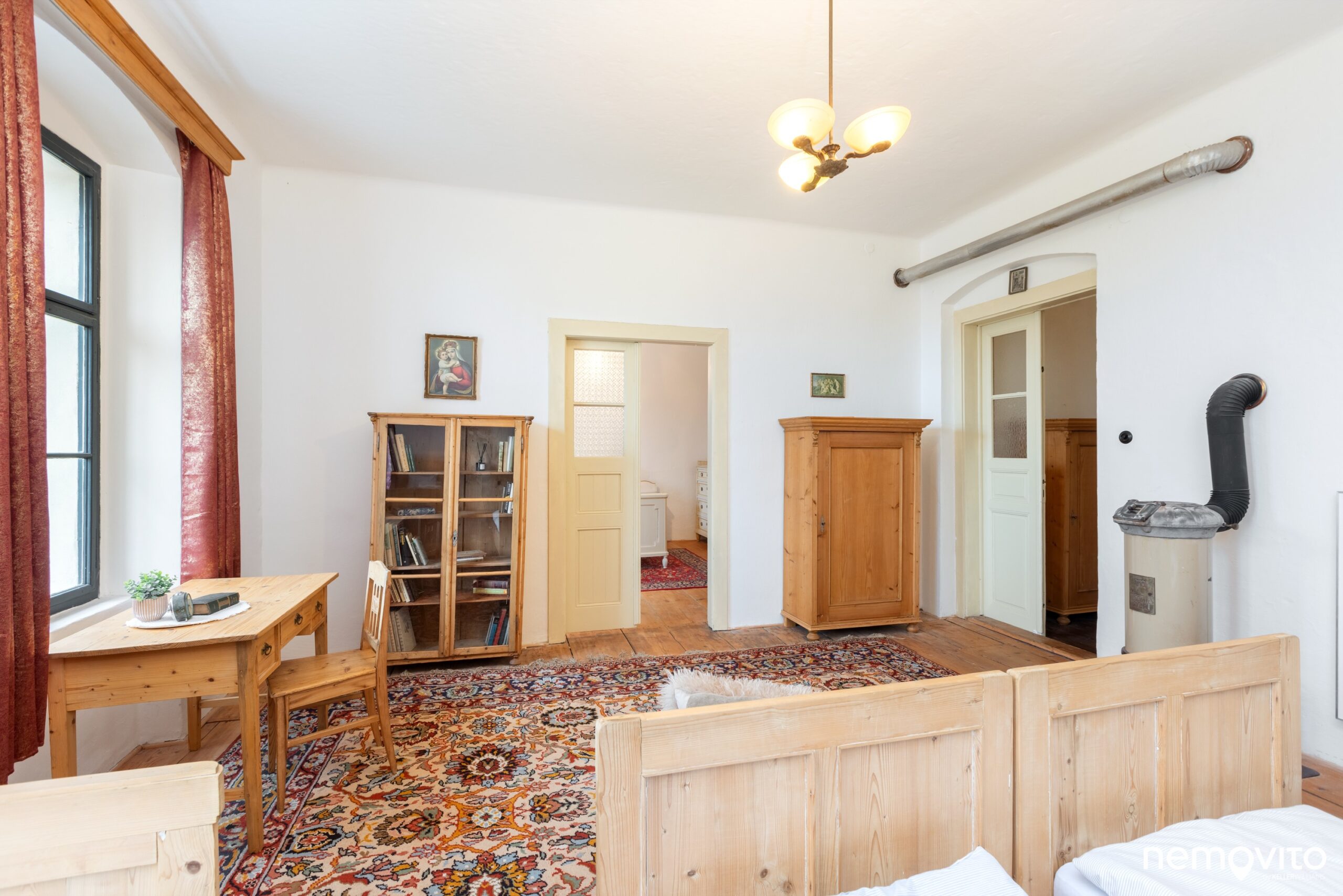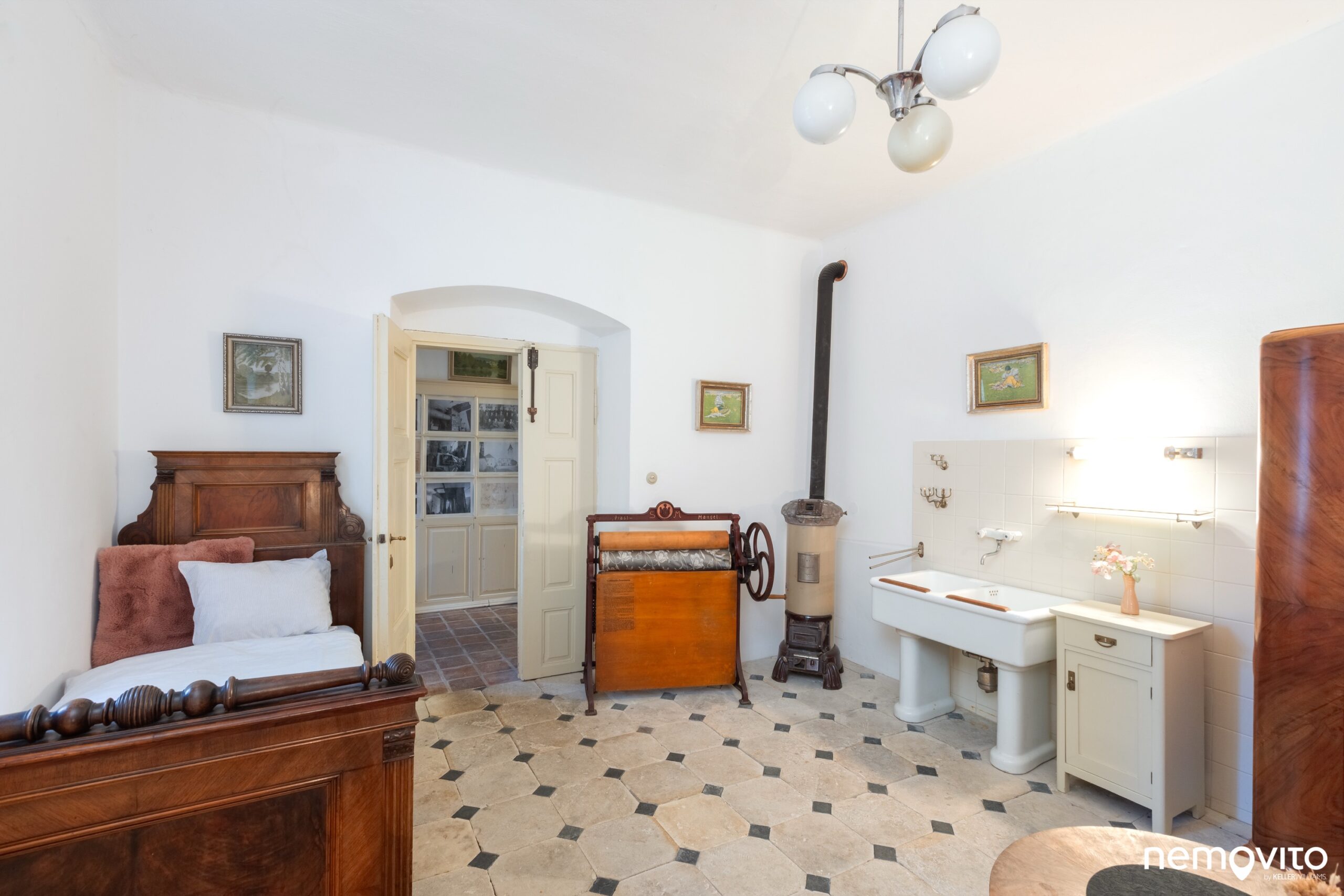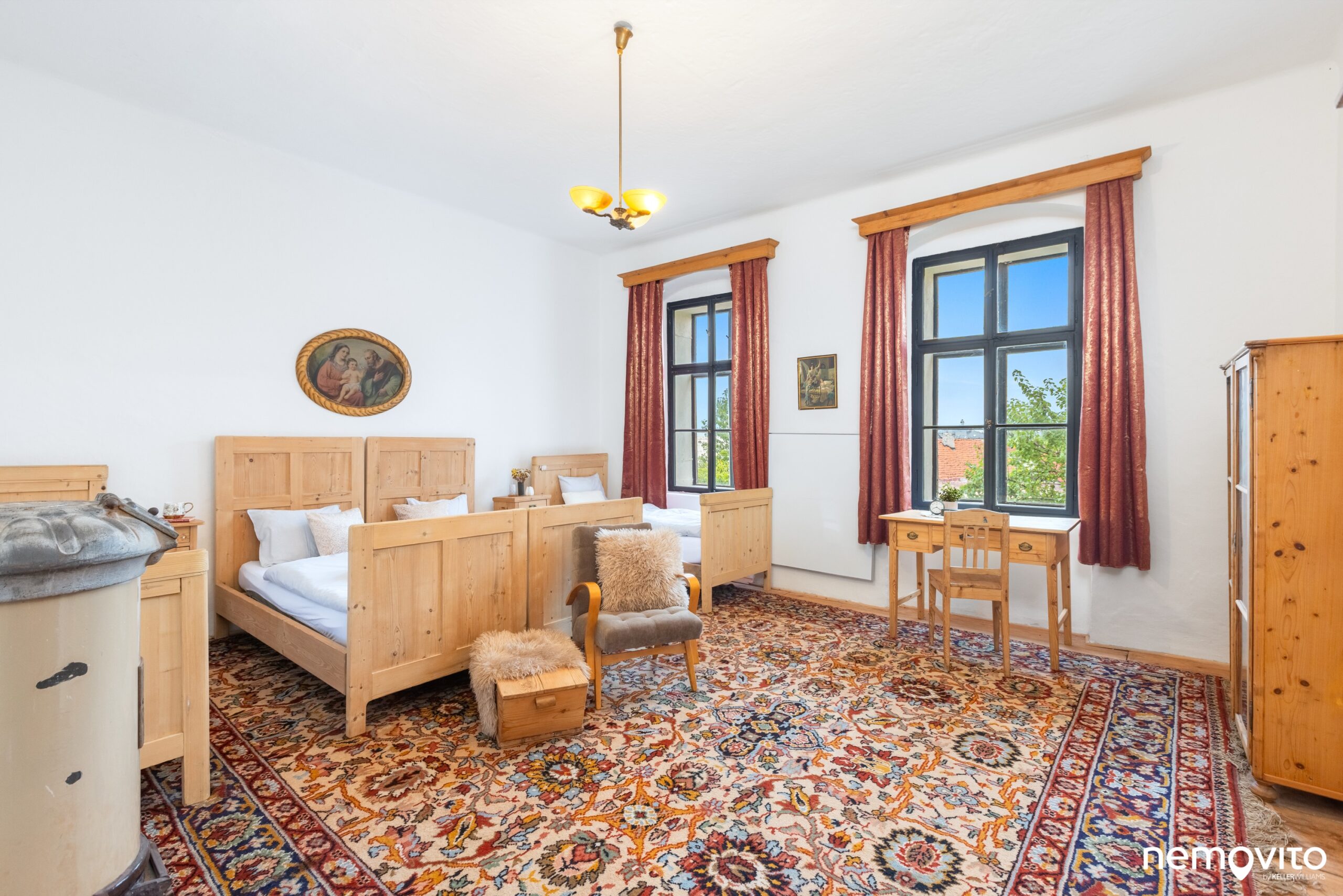 Tak jako hned první pokoj v přízemí (24 m2), ve kterém nechybí také umyvadlo nebo kamna. Okna jsou orientovaná směrem ke kostelu.