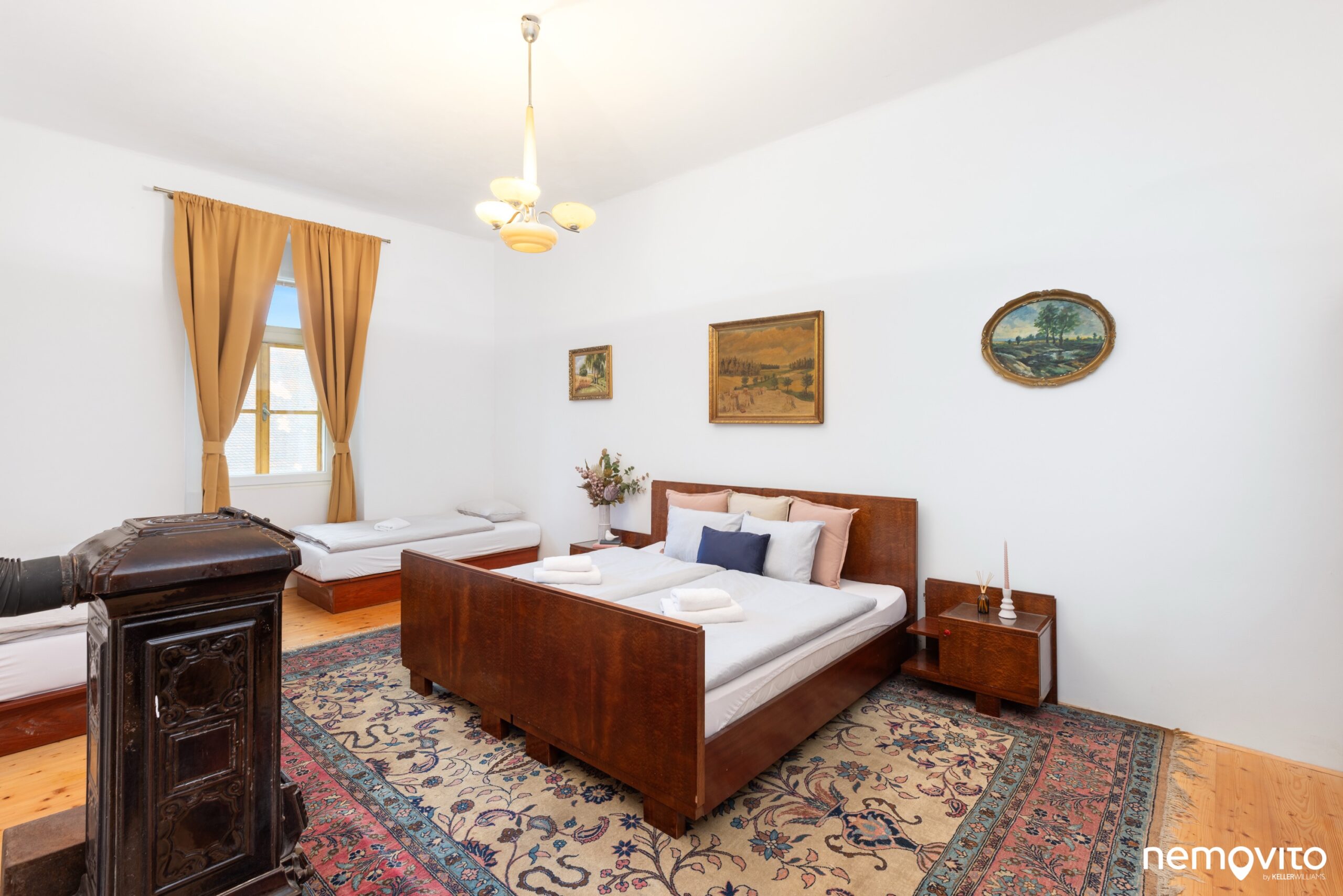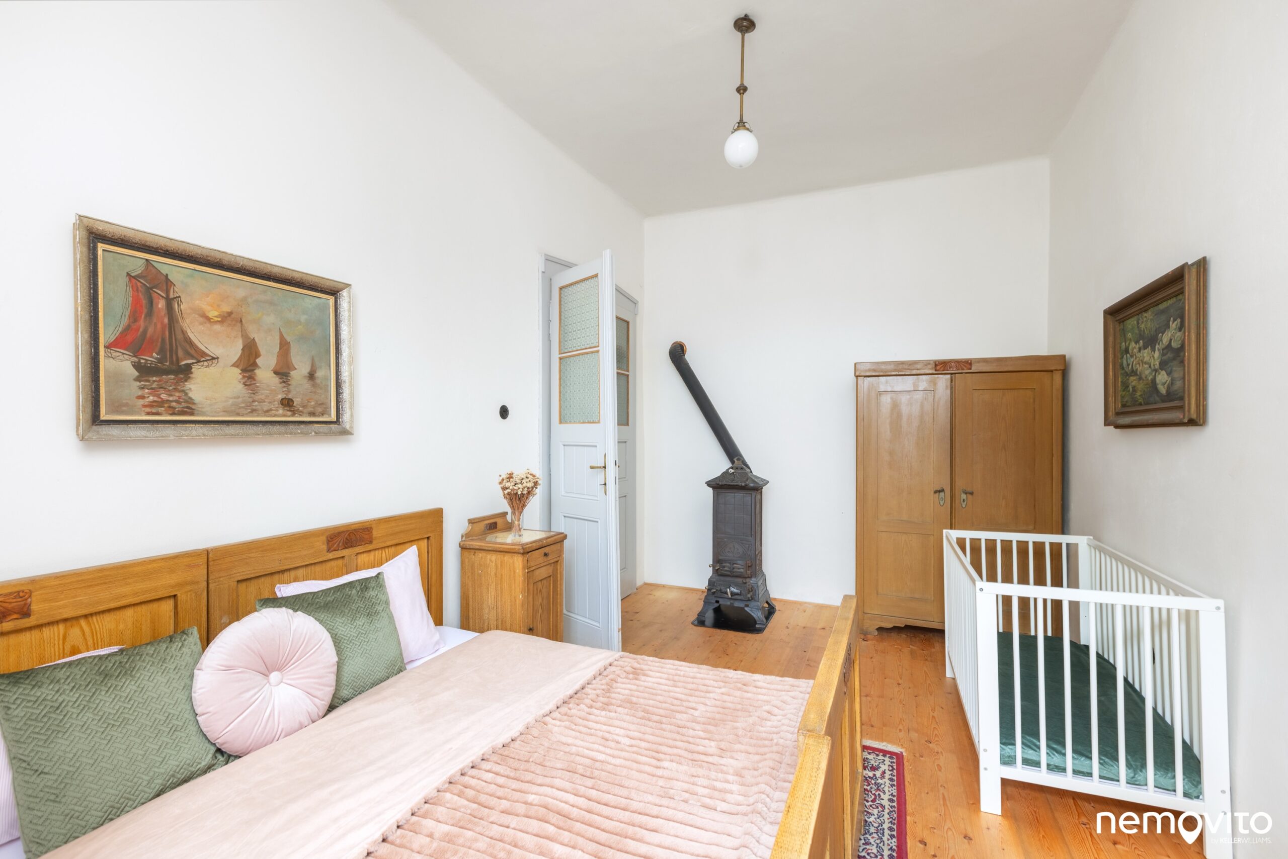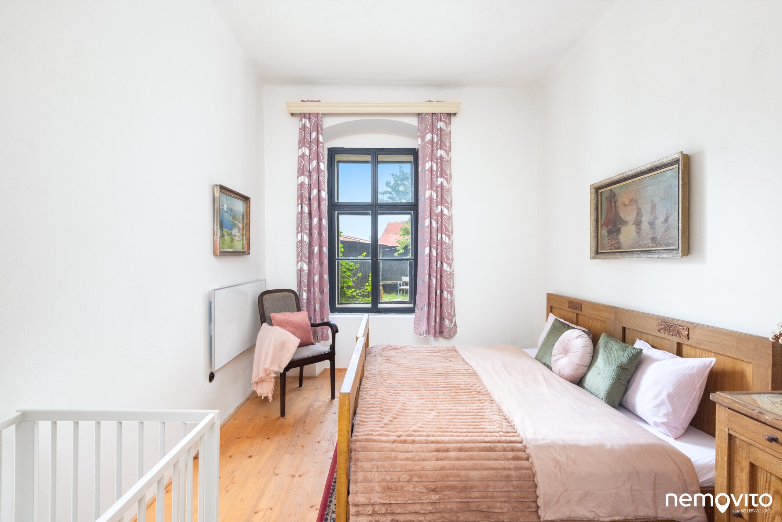 Tak jako hned první pokoj v přízemí (24 m2), ve kterém nechybí také umyvadlo nebo kamna. Okna jsou orientovaná směrem ke kostelu.