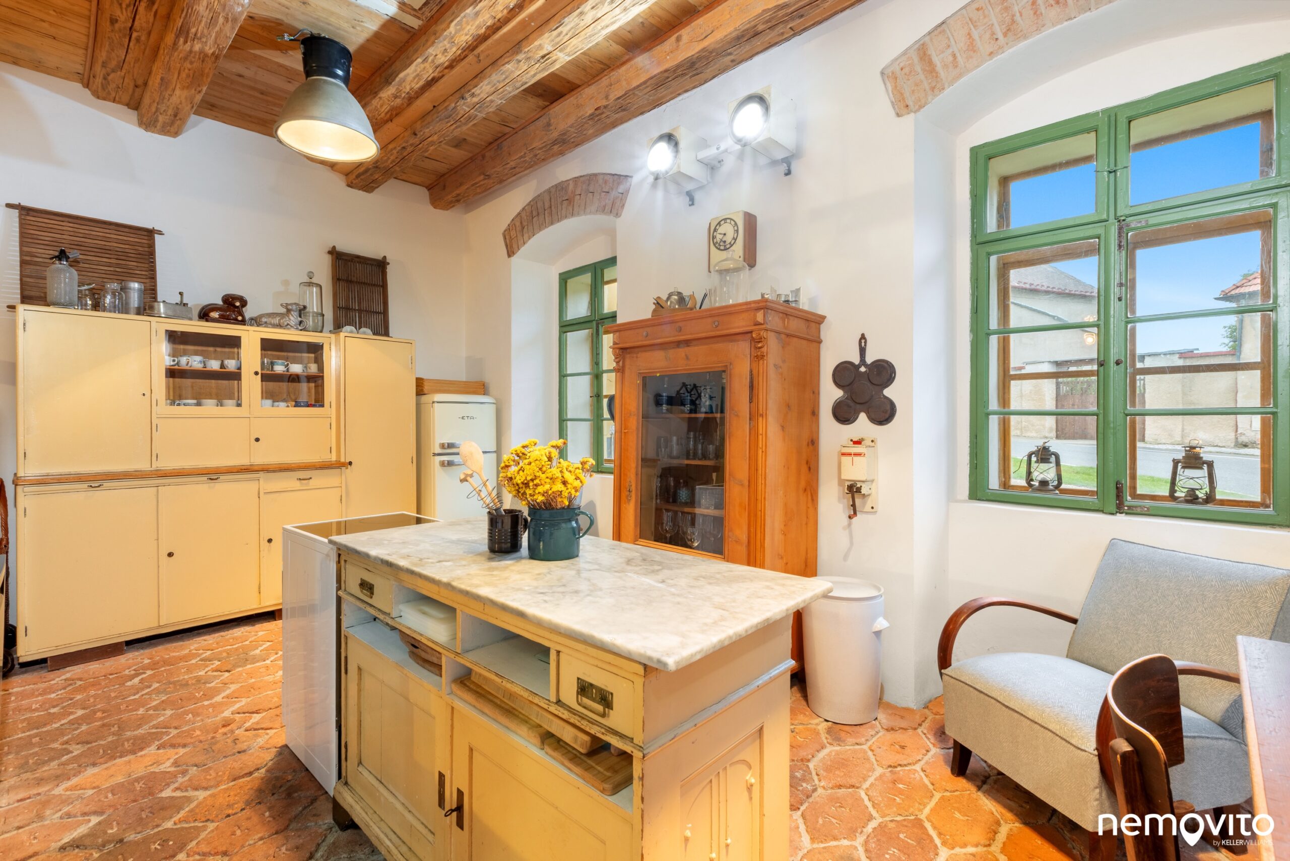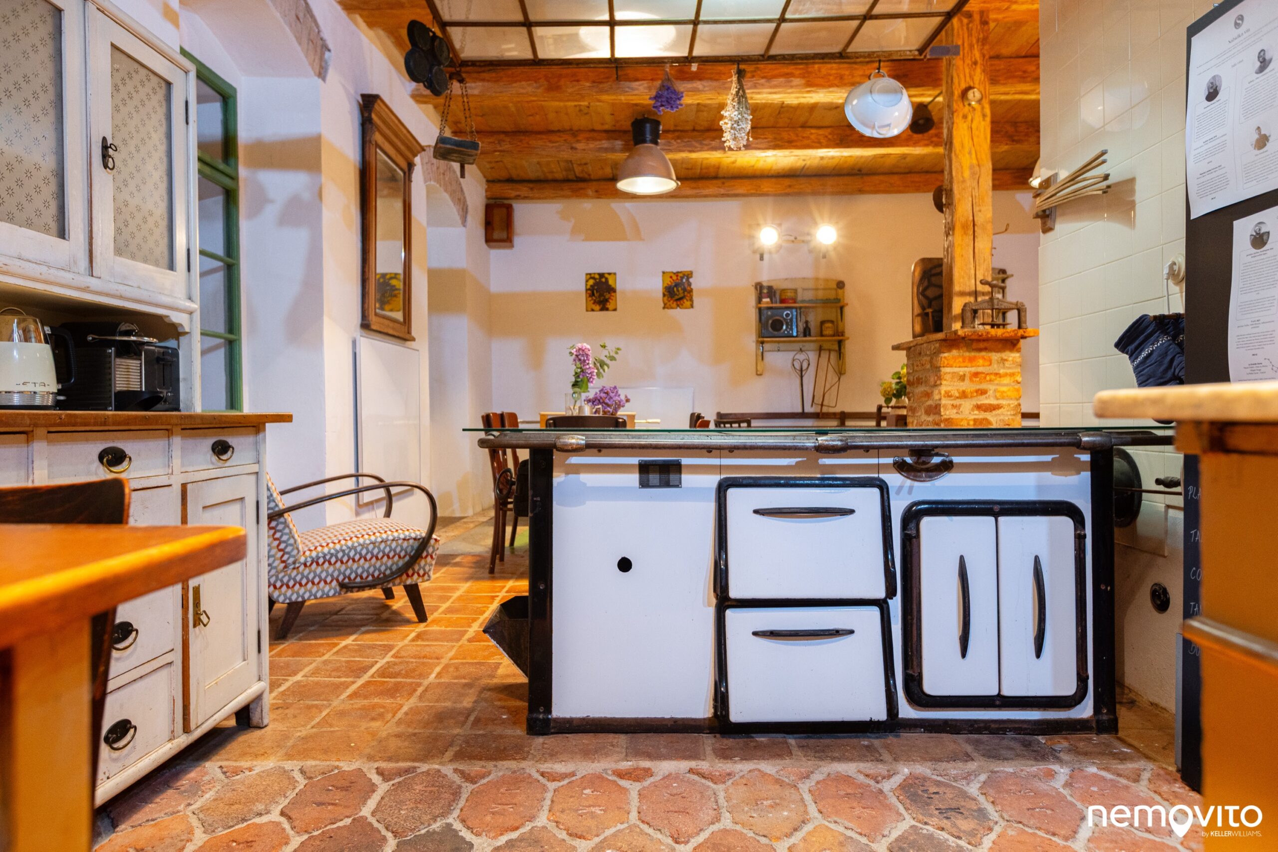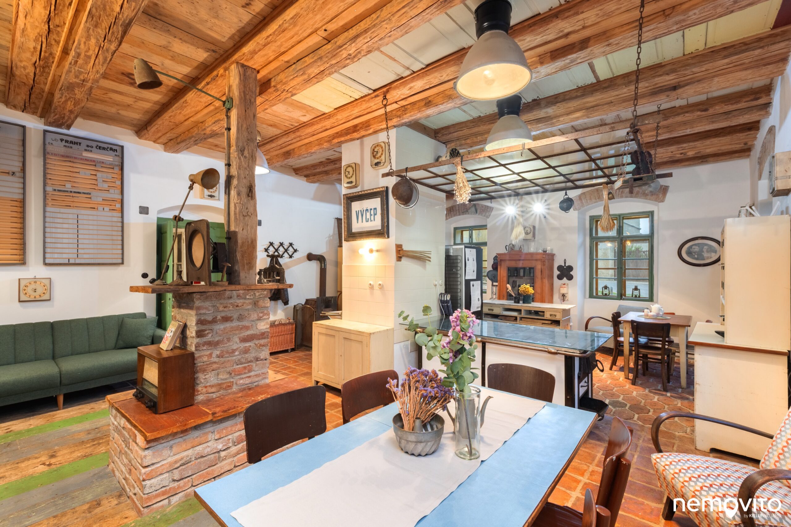 Komín je dělícím bodem sekcí, za ním je kuchyně se starými kamny a kuchyní s několika dobovými kredenci.