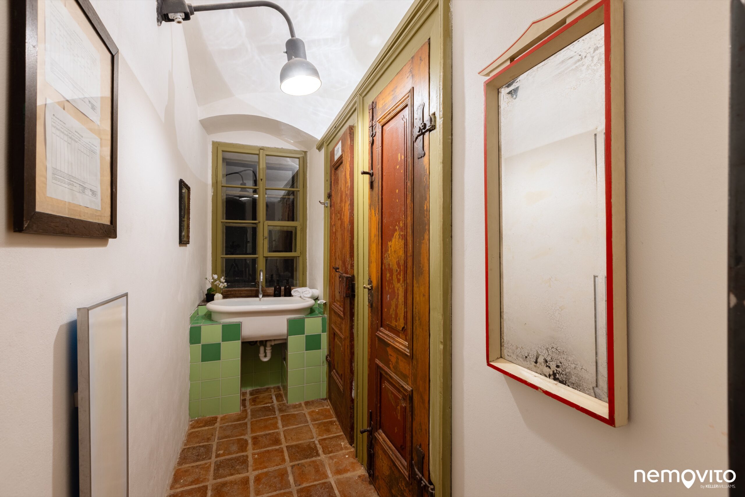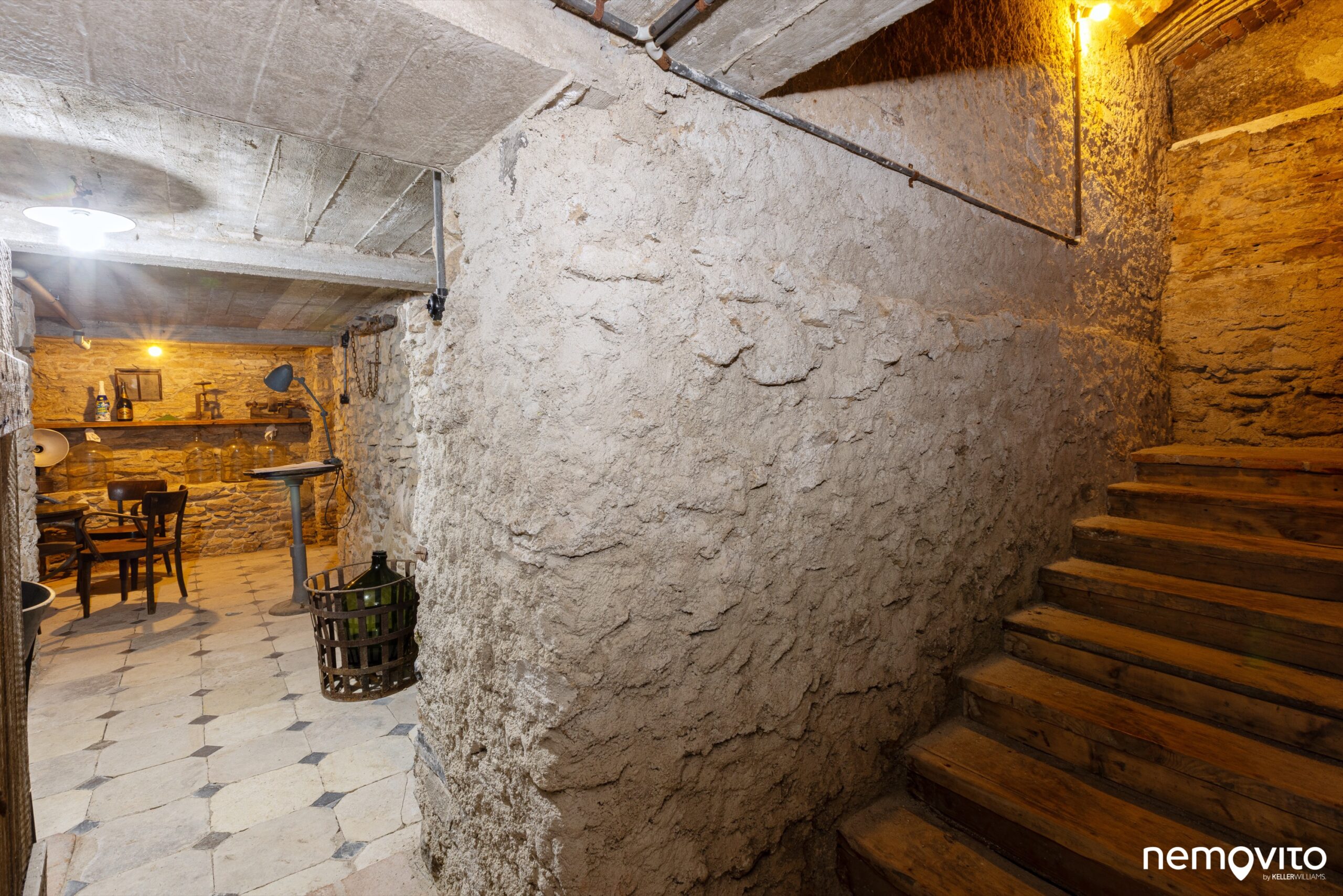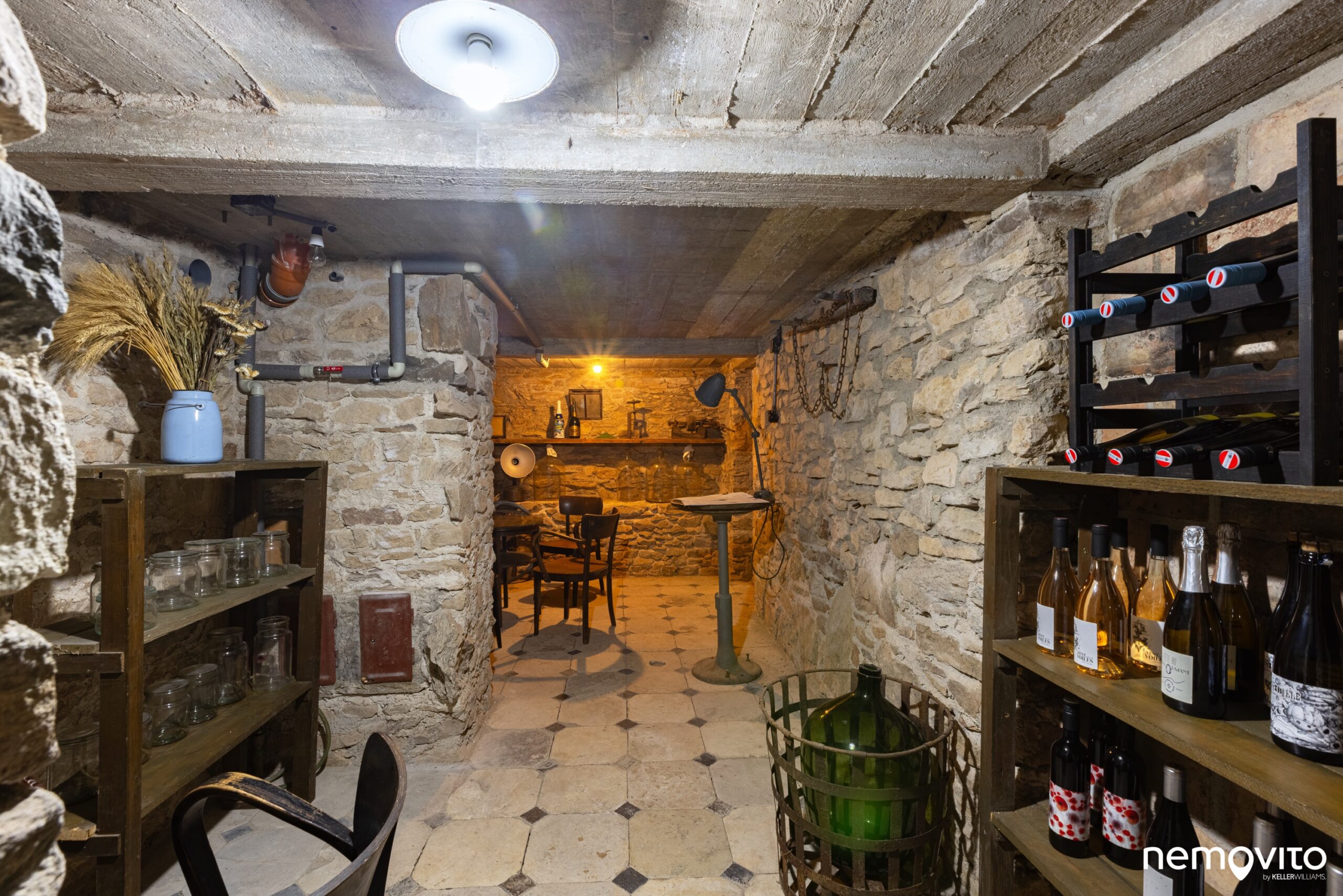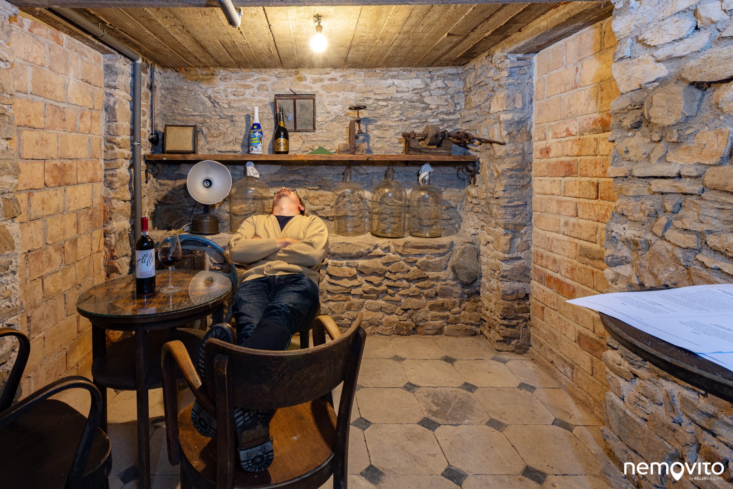 Kdo se chce ztratit před zraky ostatních a nechal se unavit tak, jako makléř na fotce, ten může zmizet v malém vinném sklípku (20 m2). Postranní chodby jsou zazděné, stejně vedly akorát k pokladu. Je tu taky schované WC, abyste nemuseli vyvádět kaskadérské kousky na schodech.