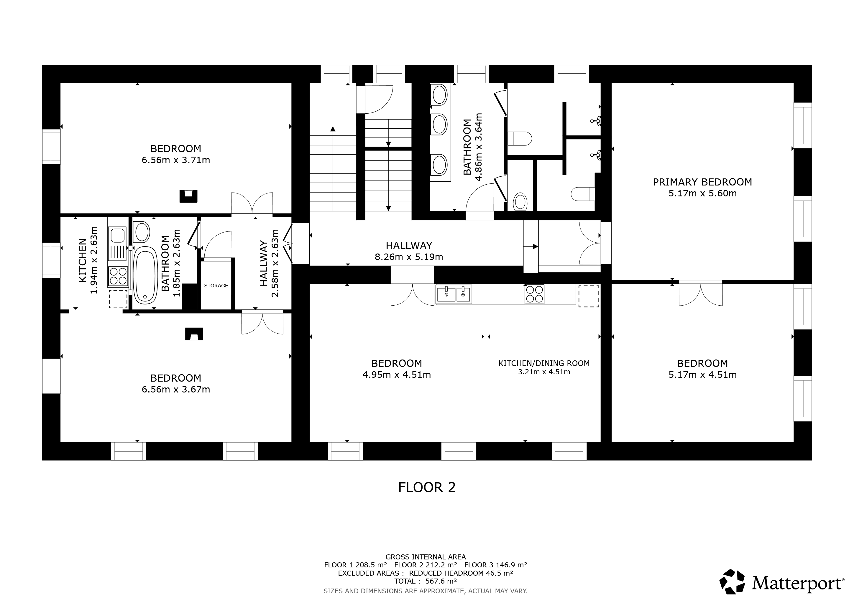Koupelna pro tři horní pokoje je společná a obsahuje 2x WC + 2x sprchu.